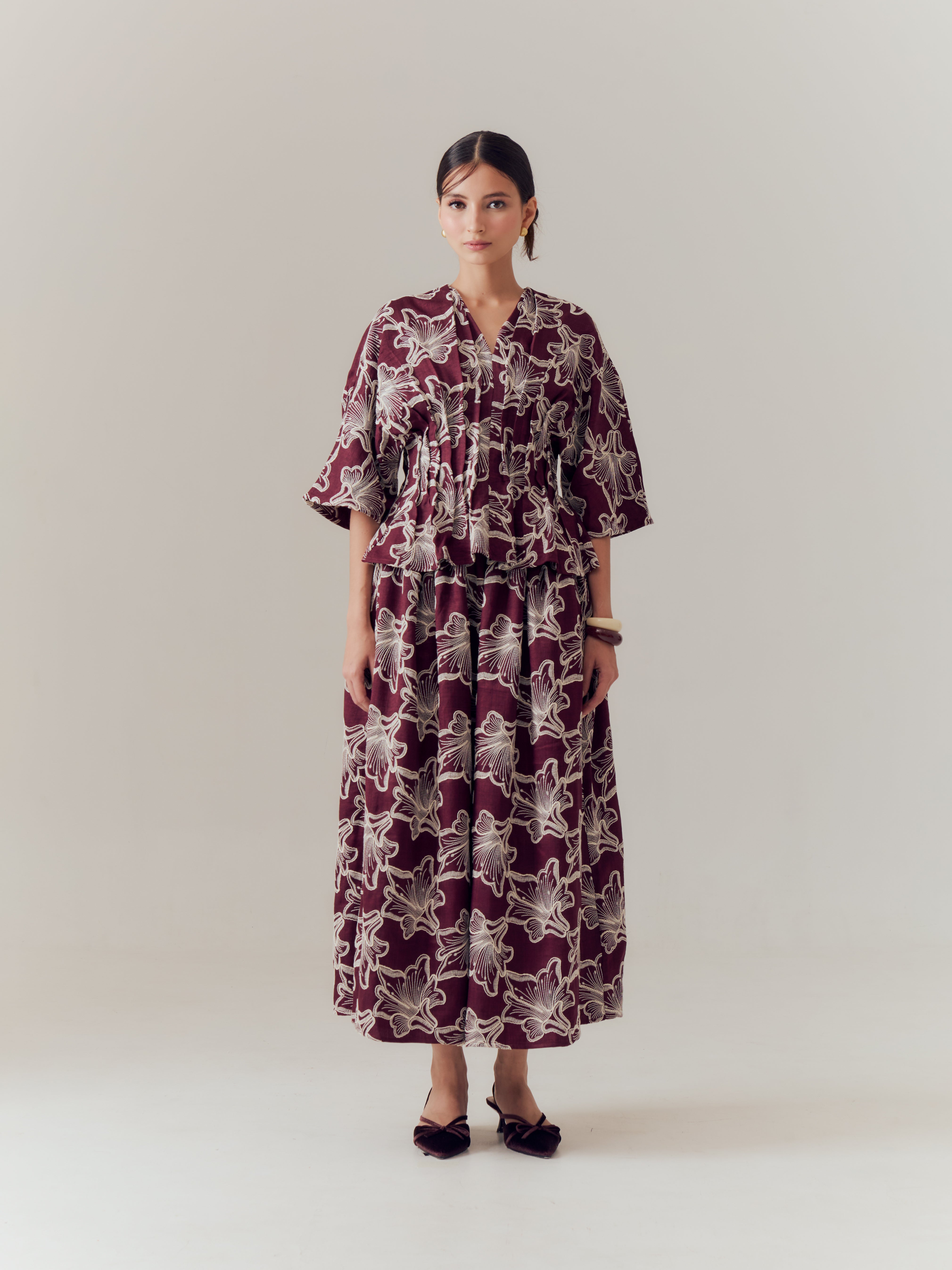 Inspired by Hanya’s signature Nia Top, the Esti Top reinterprets the familiar silhouette in an embroidered linen finish designed for everyday Raya wear. Crafted to balance structure and ease, the top features Hanya’s signature pleat detailing that gently shapes the waist while allowing natural movement and comfort throughout the day.