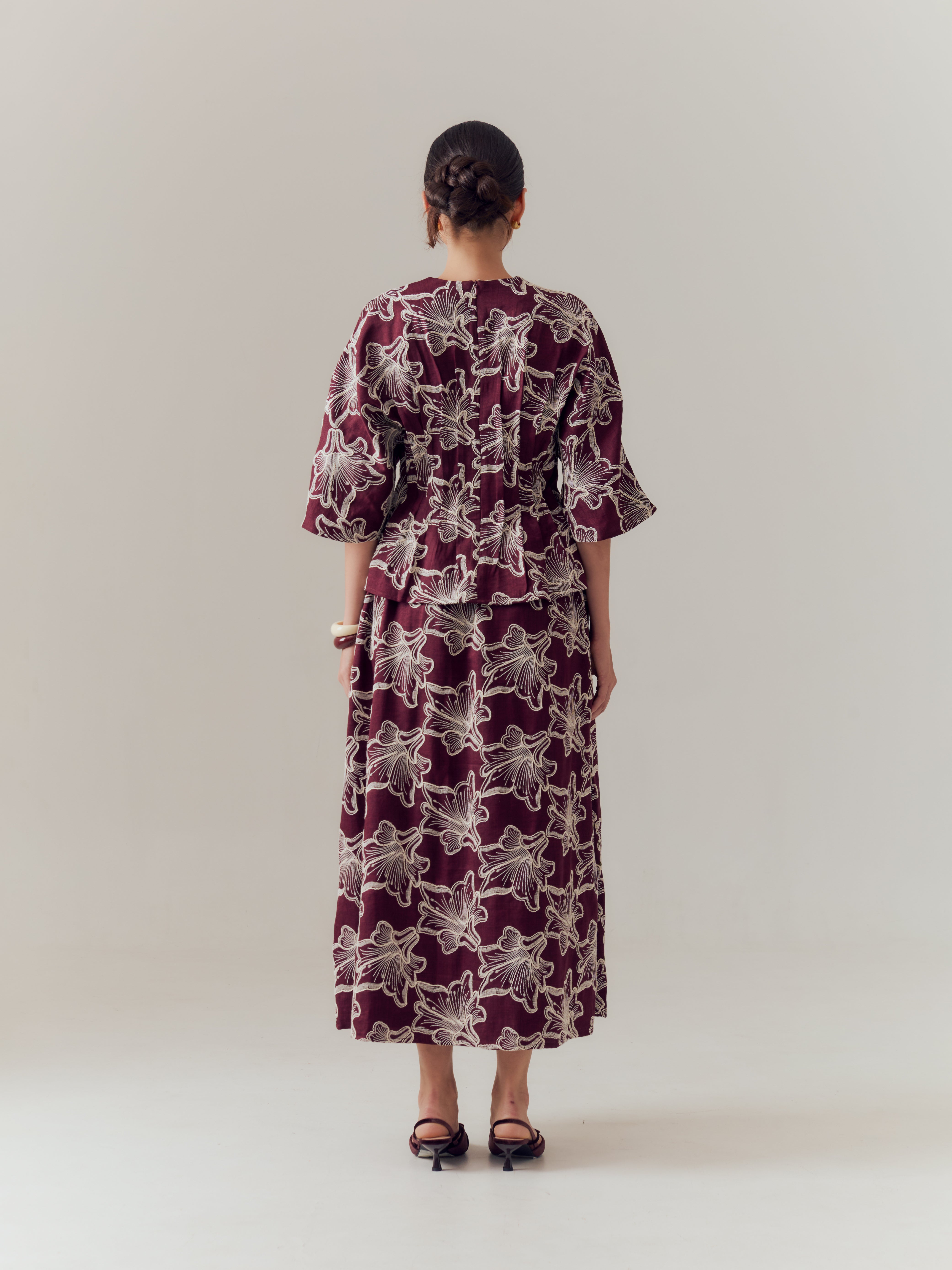 The design is finished with a clean V-cut neckline that subtly elongates the neckline, paired with relaxed three-quarter sleeves for a polished yet effortless look. A concealed back zipper ensures ease of wear while maintaining a clean finish. Lightweight and unlined, the Esti Top is breathable and easy to wear, making it a versatile choice for festive mornings through to evening gatherings.