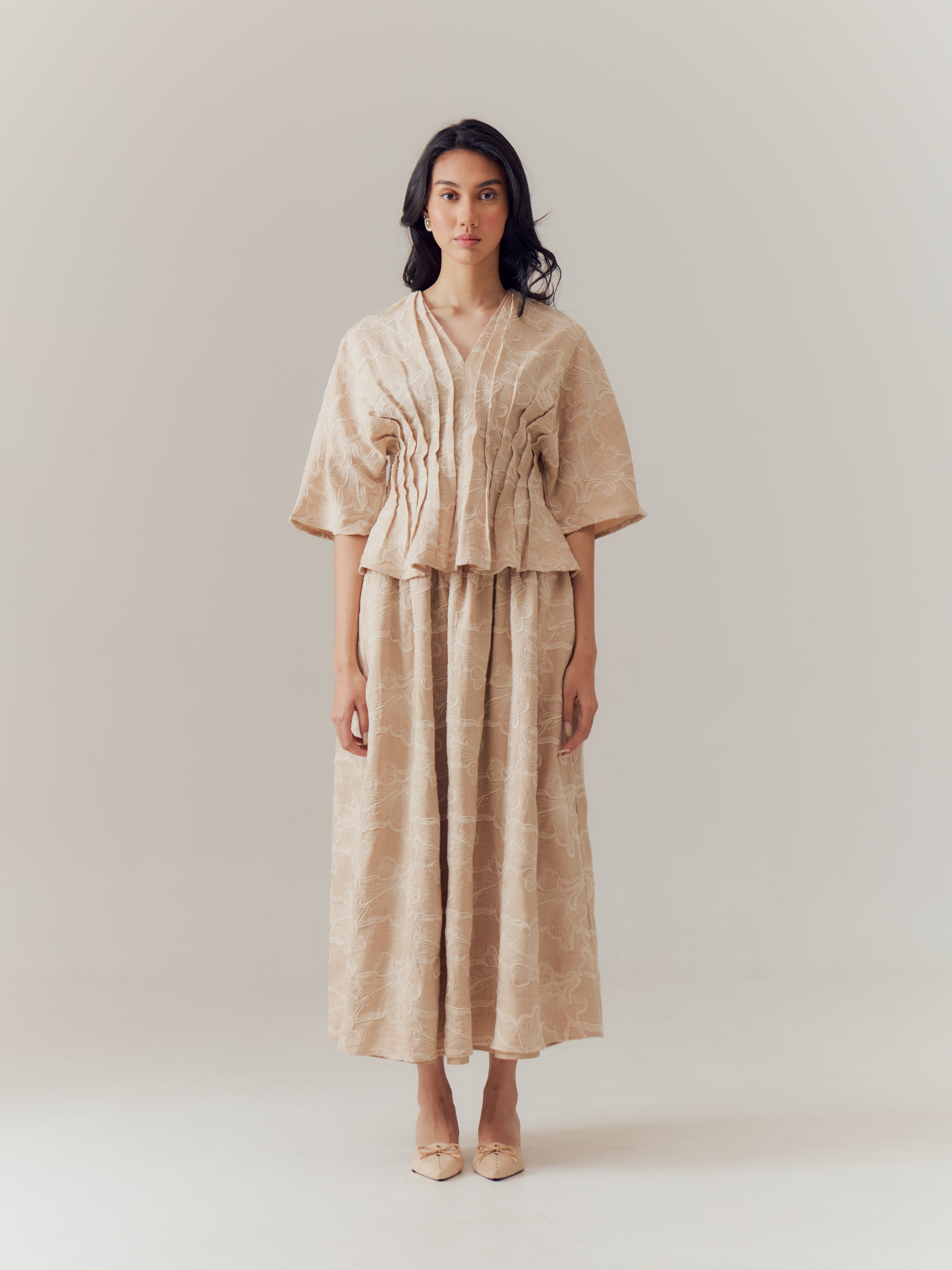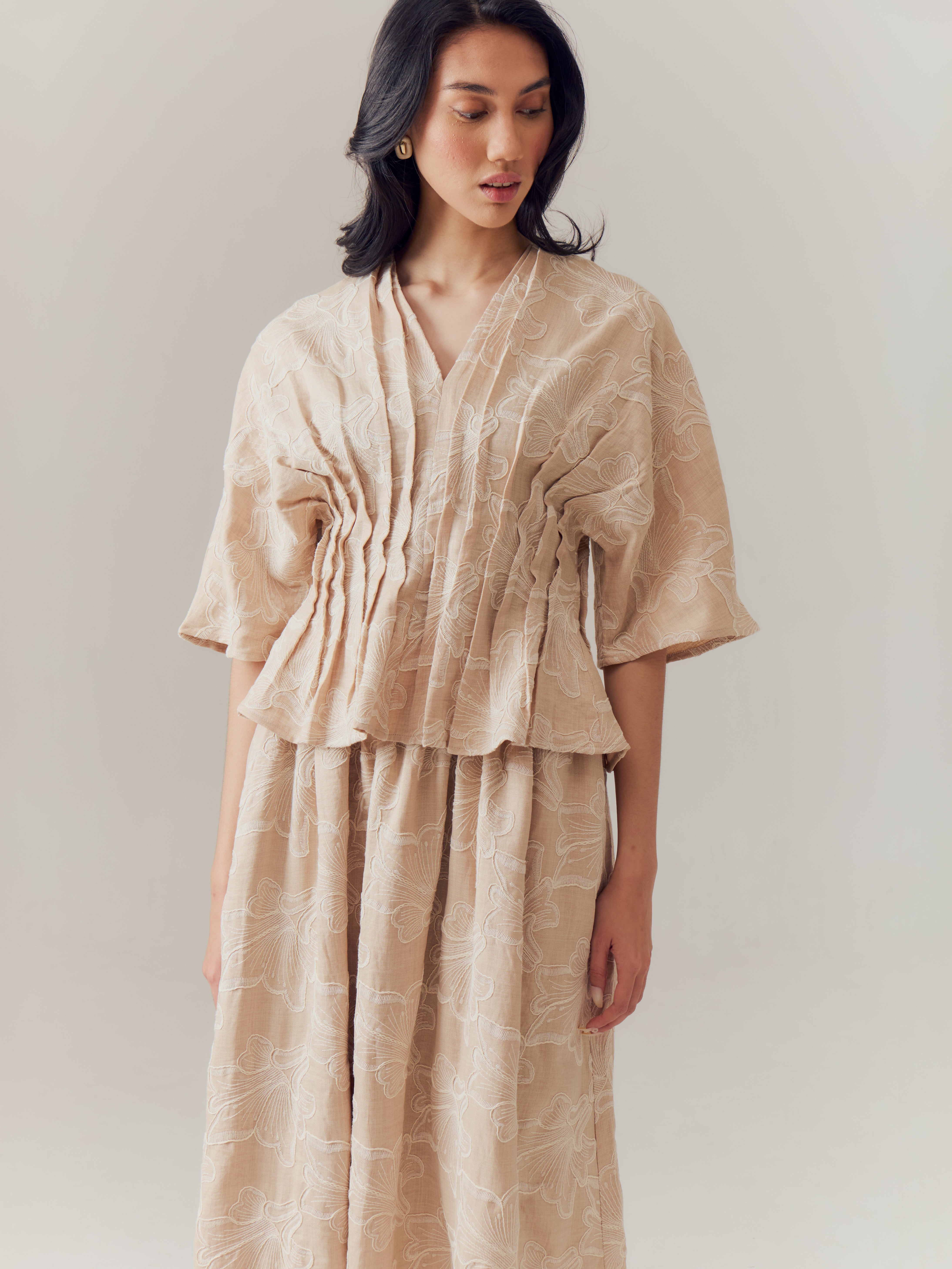 Inspired by Hanya’s signature Nia Top, the Esti Top reinterprets the familiar silhouette in an embroidered linen finish designed for everyday Raya wear. Crafted to balance structure and ease, the top features Hanya’s signature pleat detailing that gently shapes the waist while allowing natural movement and comfort throughout the day.