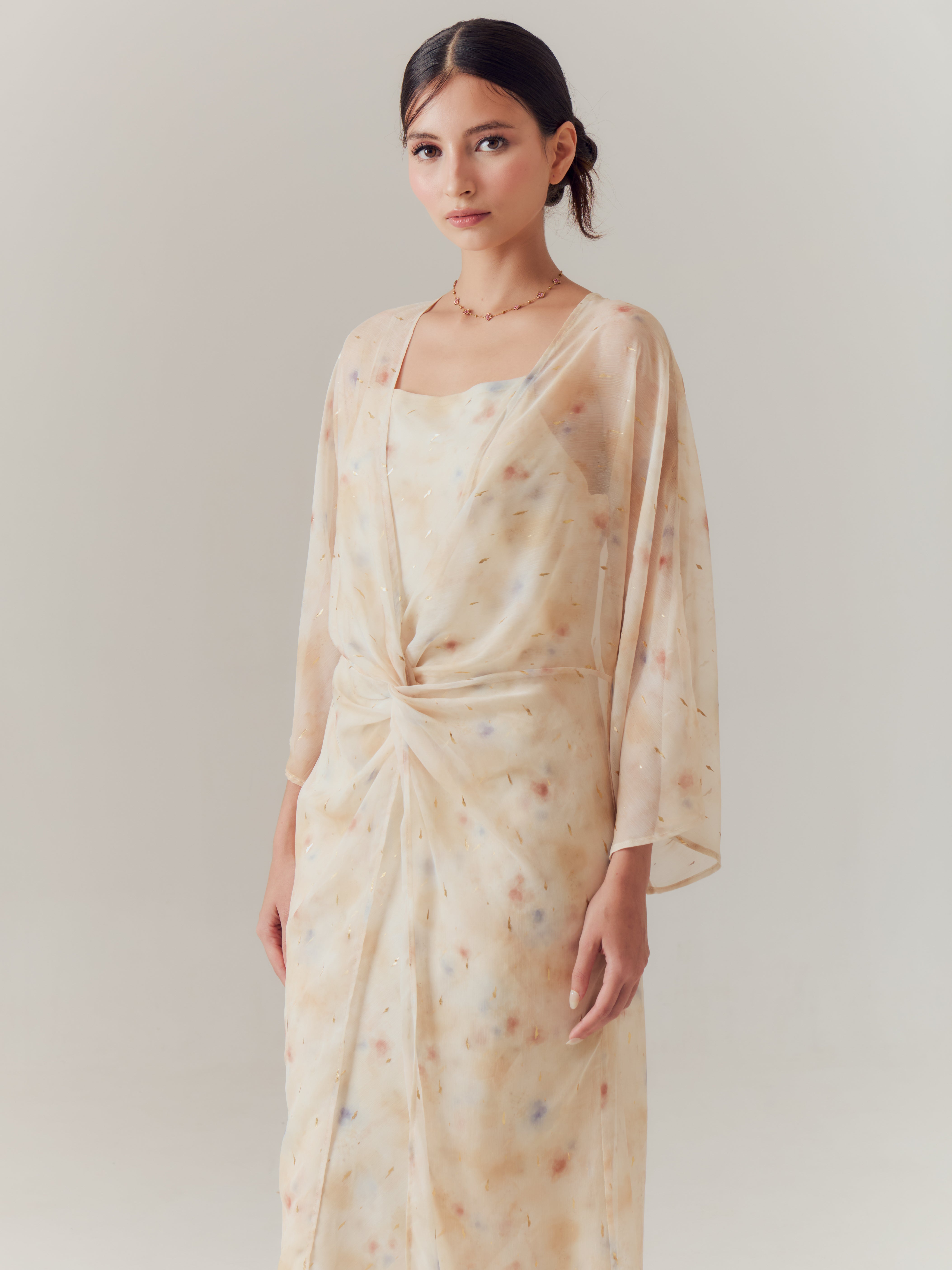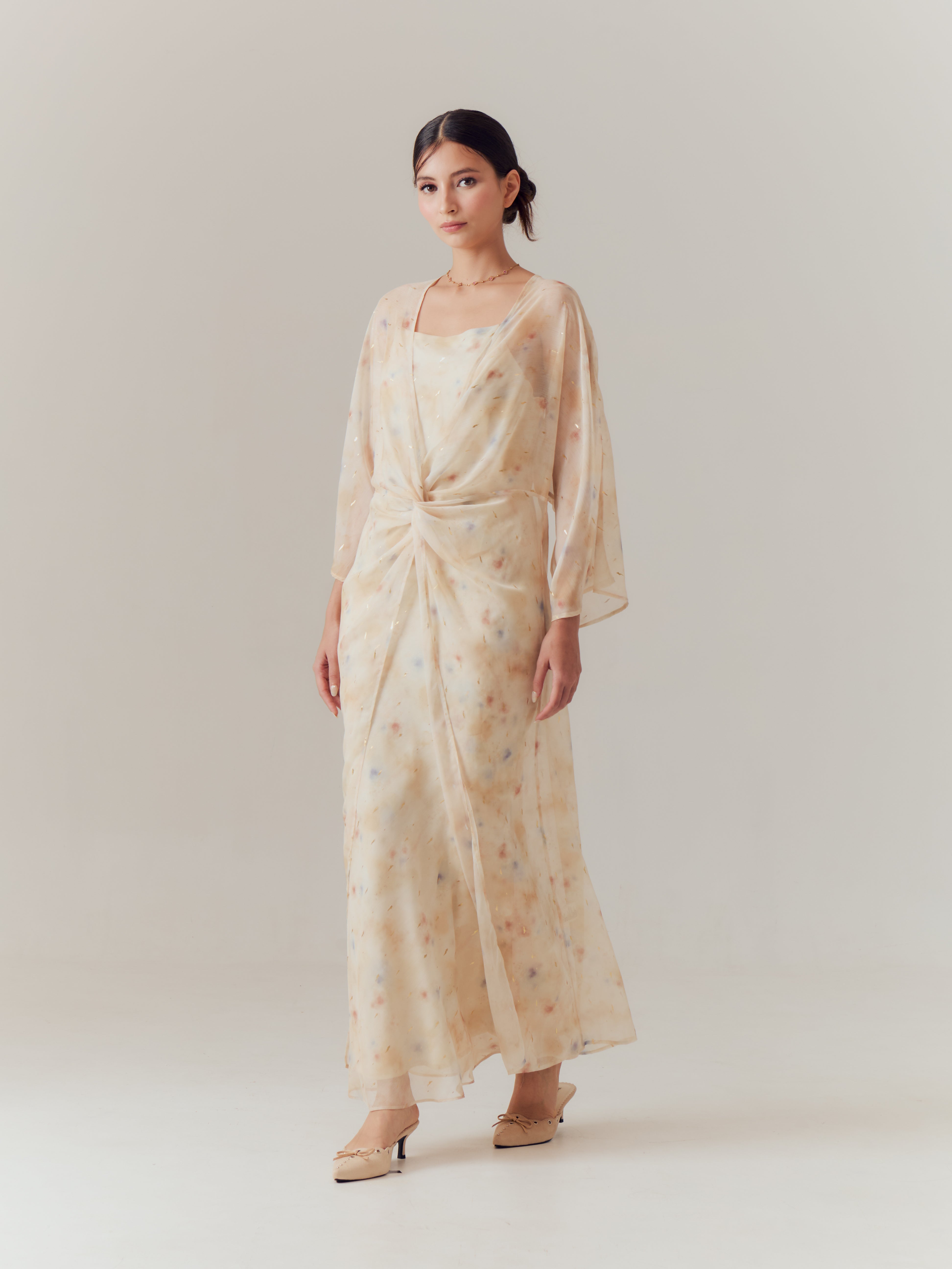 This kaftan is designed with a soft, layered silhouette that embodies effortless elegance. The soft yellow sleeveless base dress provides a graceful foundation, while the lightweight chiffon outer layer flows beautifully with every movement, creating a delicate, ethereal presence. Lila Kaftan is thoughtfully crafted for festive occasions but versatile enough to be worn beyond the season, offering a timeless piece for both celebrations and everyday elegance.