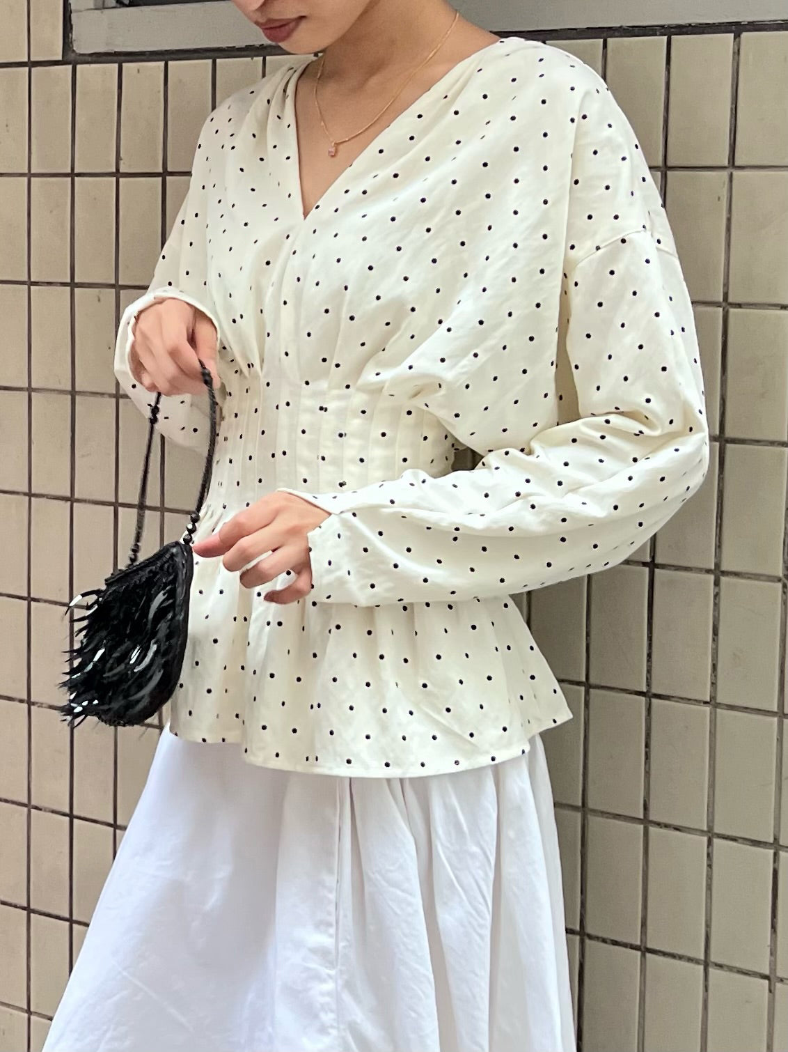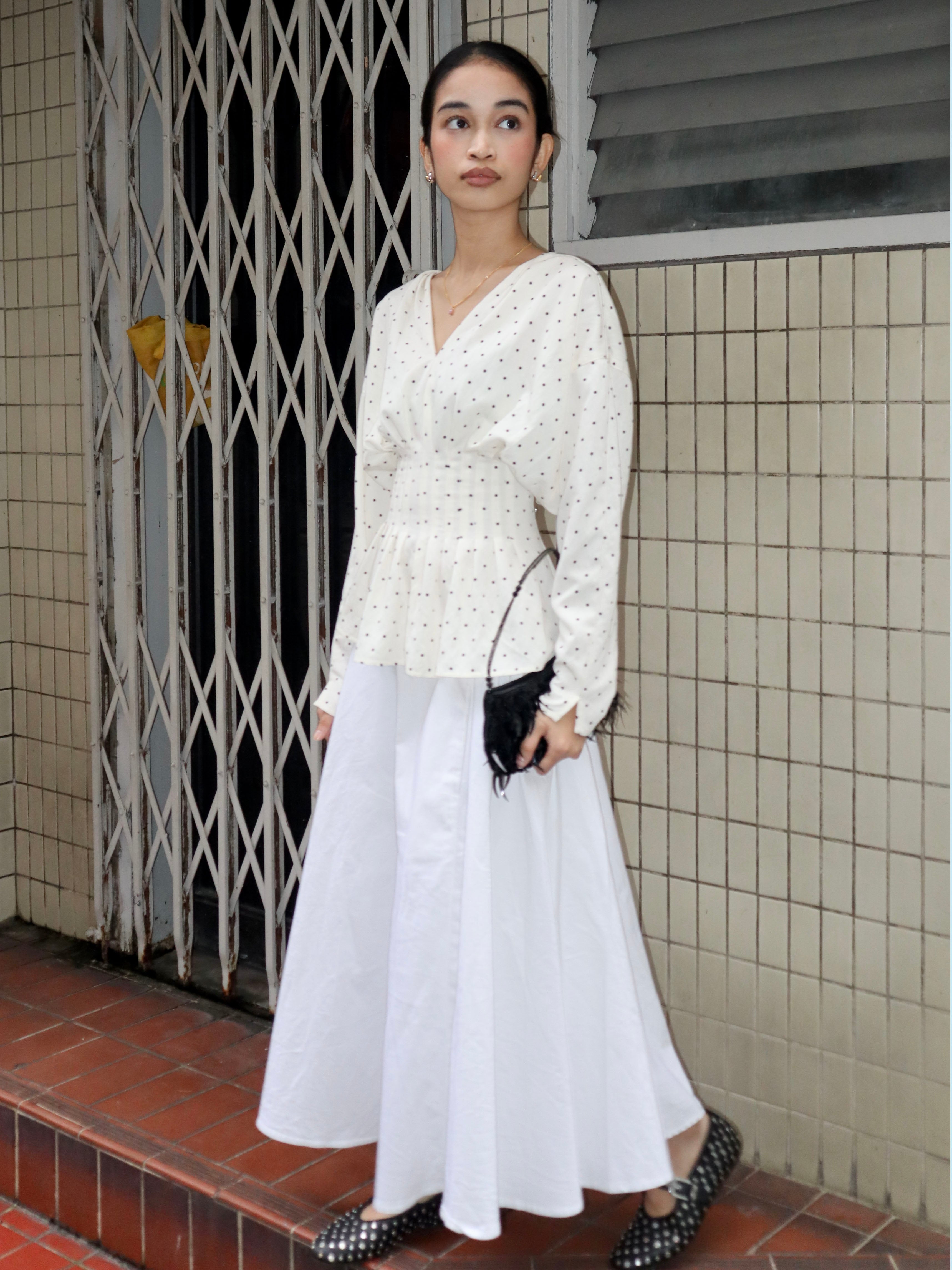 Discover the charm of our Nara Top in a playful polka print. Retaining the flattering silhouette you love, it features 12 tailored pleats for an elegant fit. This top offers comfort without compromising style. Complete with a V-neckline, long sleeves, and a zip closure at the back, it’s a versatile wardrobe essential made with care in Malaysia.