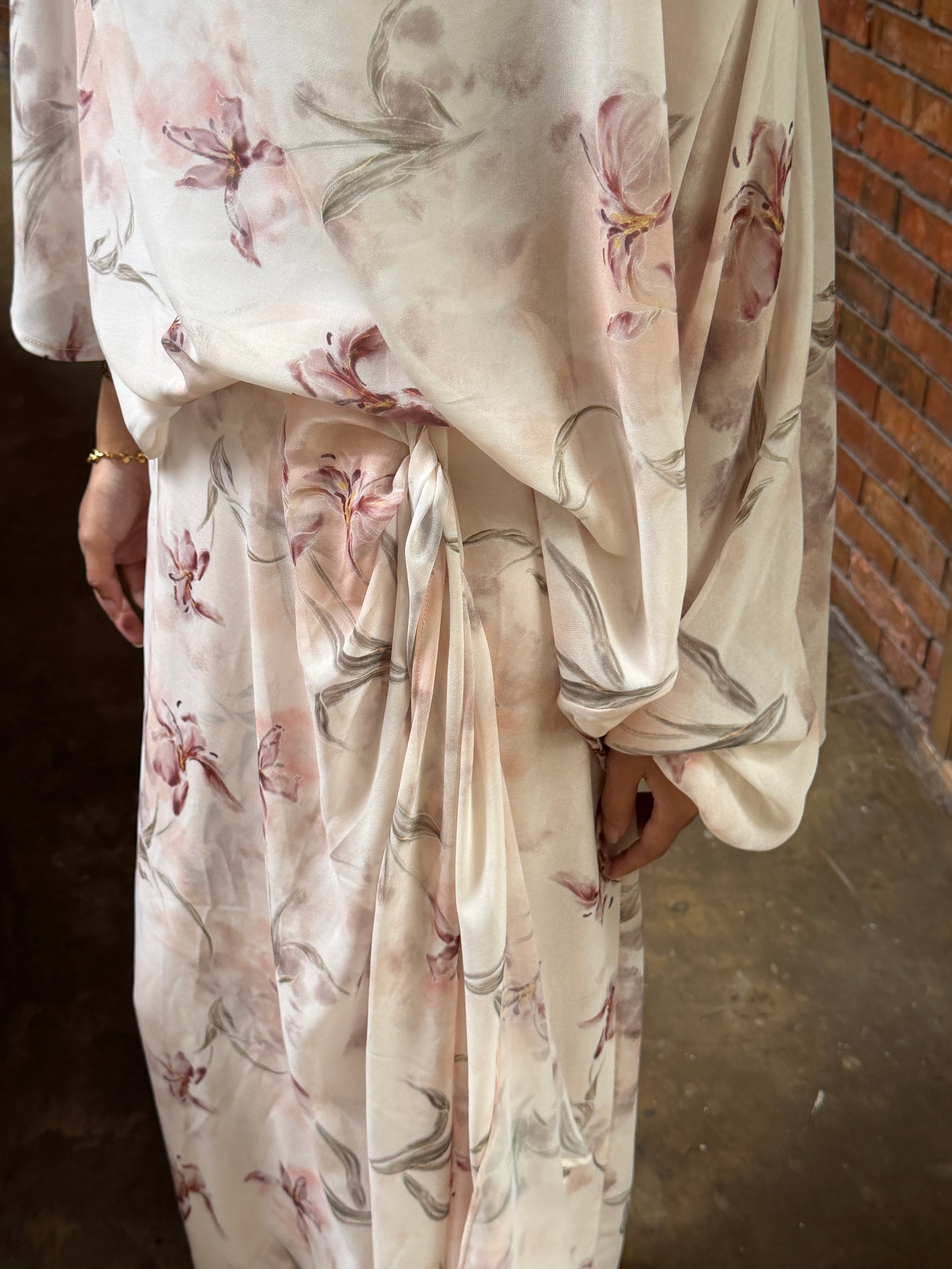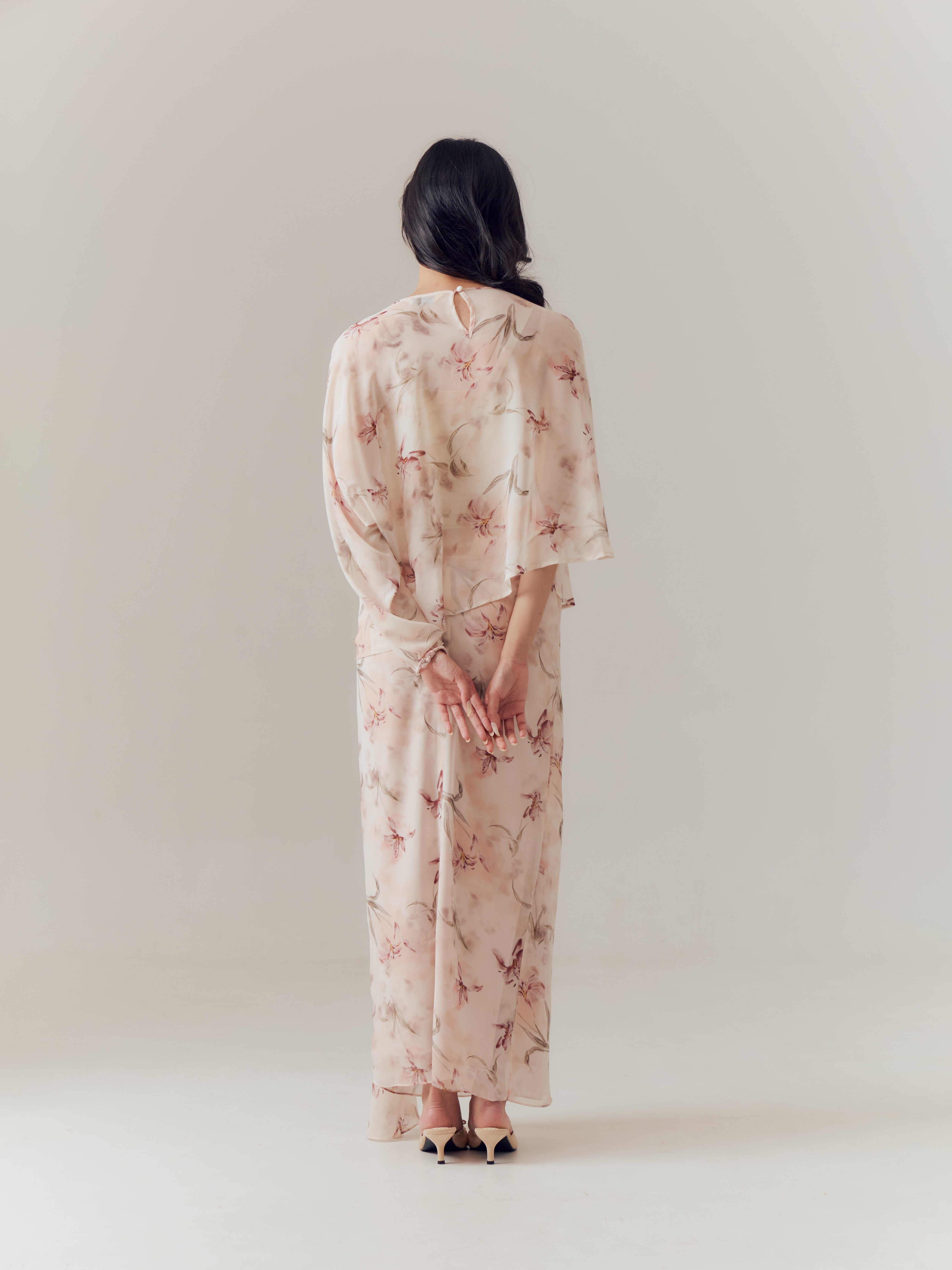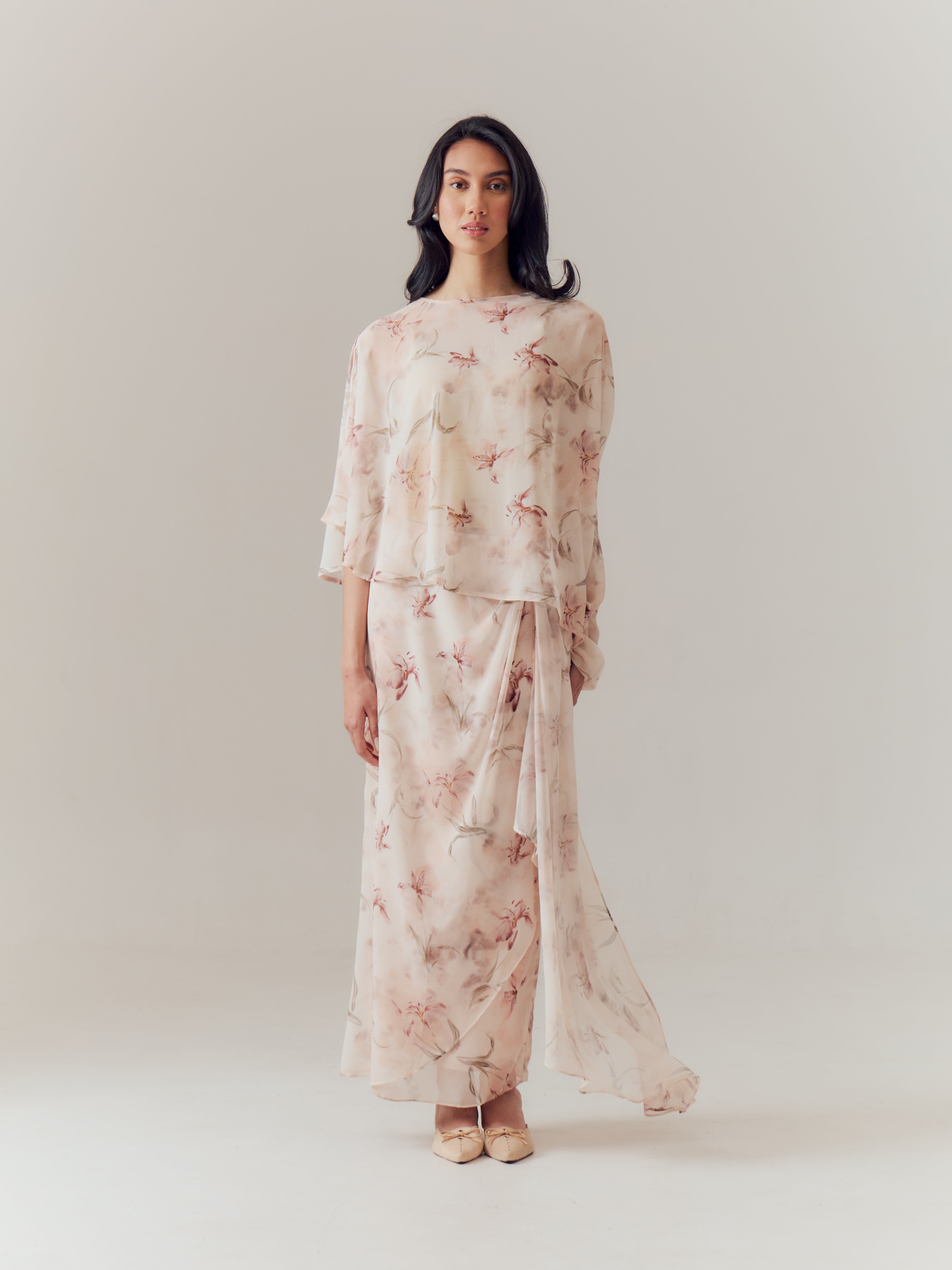 Designed with a soft, fluid silhouette that embraces effortless femininity. Crafted from airy chiffon adorned with an orchid water print, the fabric drapes gracefully with every movement, creating a light and elegant presence. The delicate floral motif flows seamlessly across the design, offering a refined yet modern take on festive dressing.