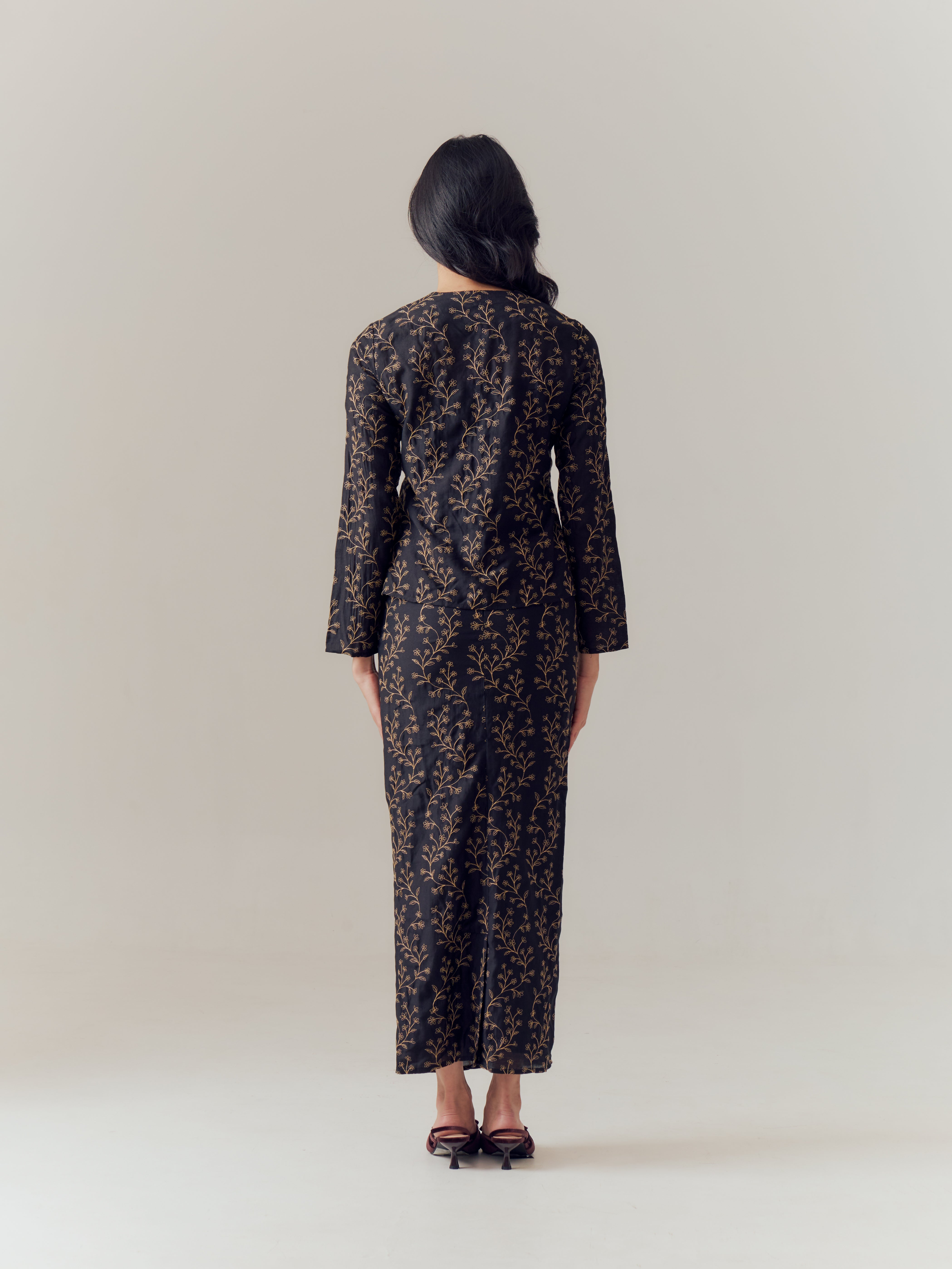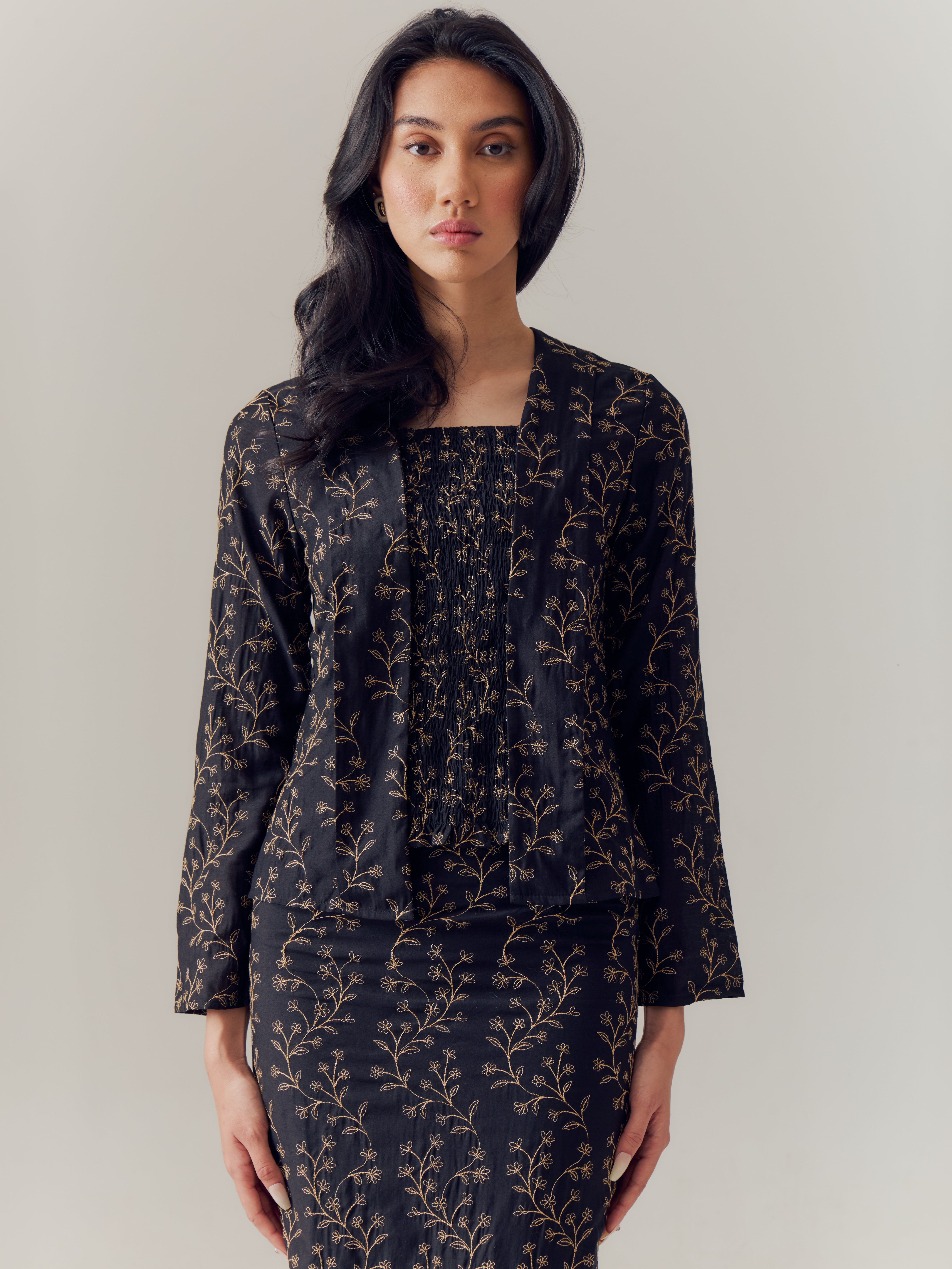 Rita Kurung reimagines the timeless kebaya silhouette with a modern, versatile touch. Crafted from mixed rayon adorned with delicate floral embroidery, the classic black base offers a refined contrast that feels both elegant and distinctive. The subtle embroidered blooms add texture and character, elevating the piece while maintaining its understated charm.