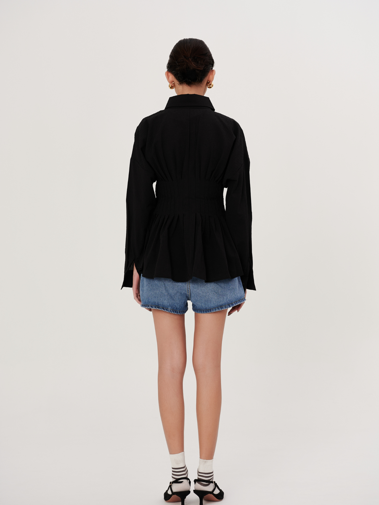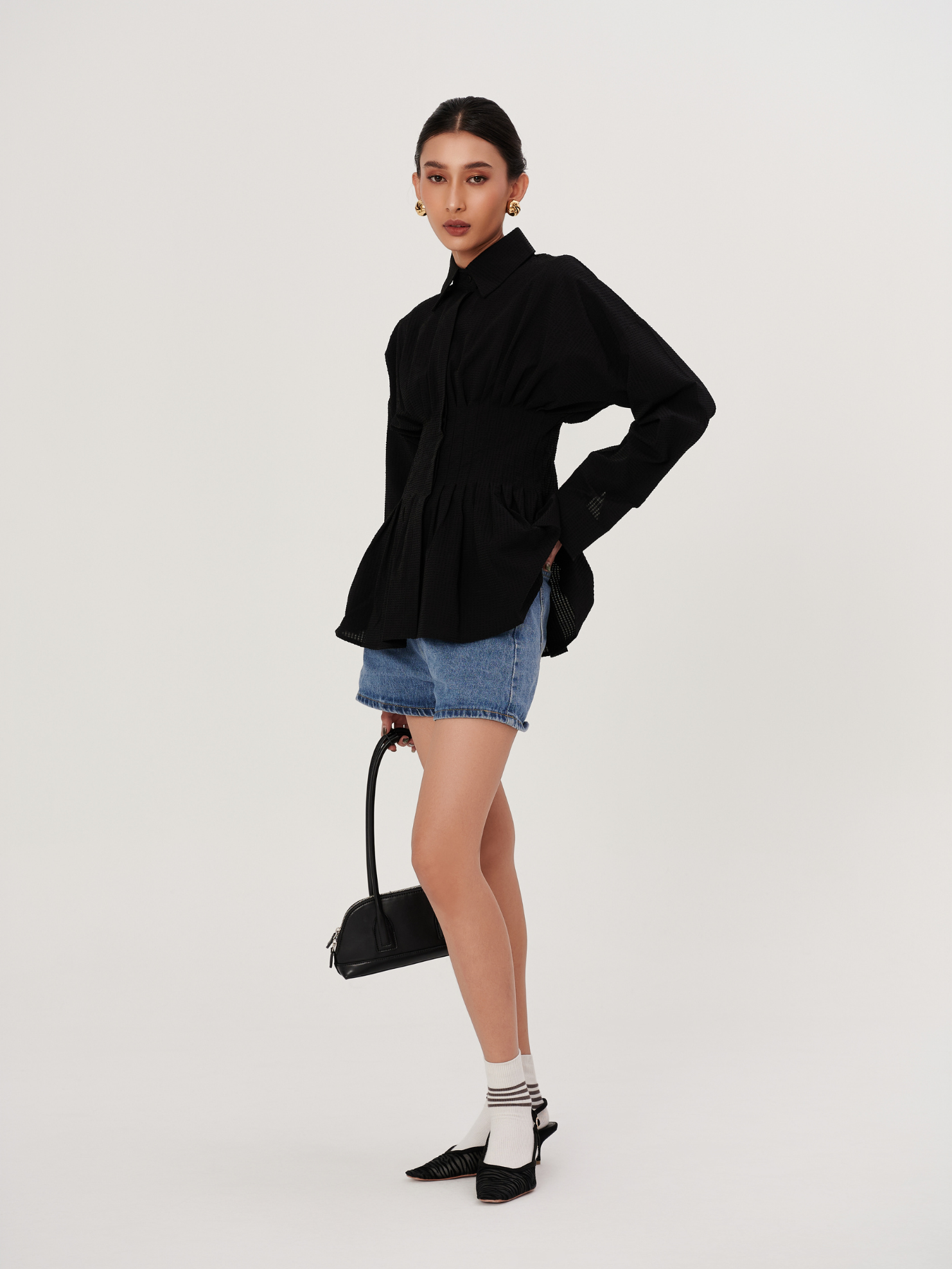 Introducing the Yara Top — a timeless piece inspired by the structured charm of our signature silhouettes. Designed with a classic collar and a concealed button placket, it features a pleated waist that defines the shape beautifully.Now upgraded with a premium 3D textured cotton/polyester blend.The addition of cuff sleeves adds a touch of luxury, making it an exquisite choice for both casual and elevated occasions.Rooted in Malaysian craftsmanship