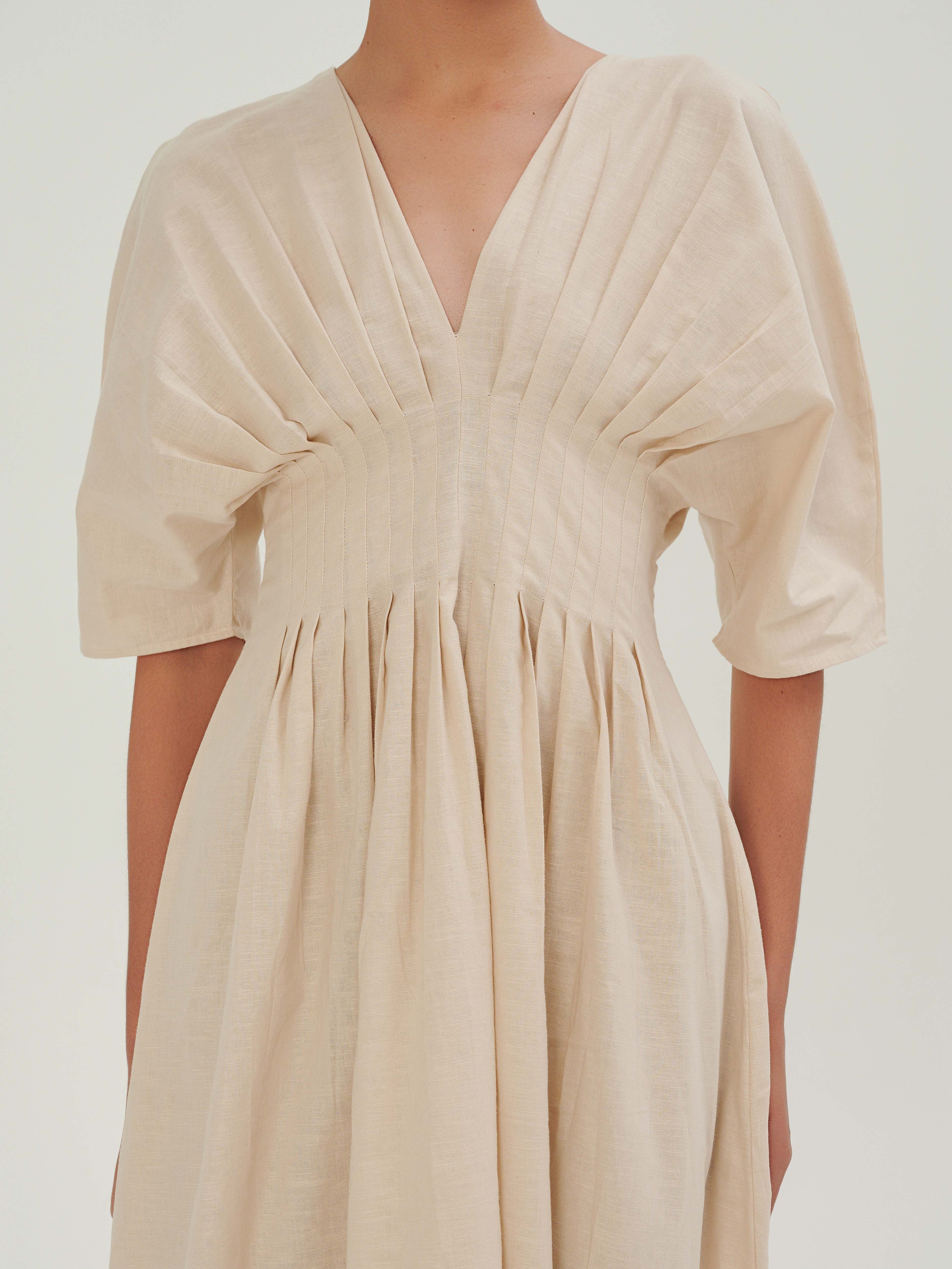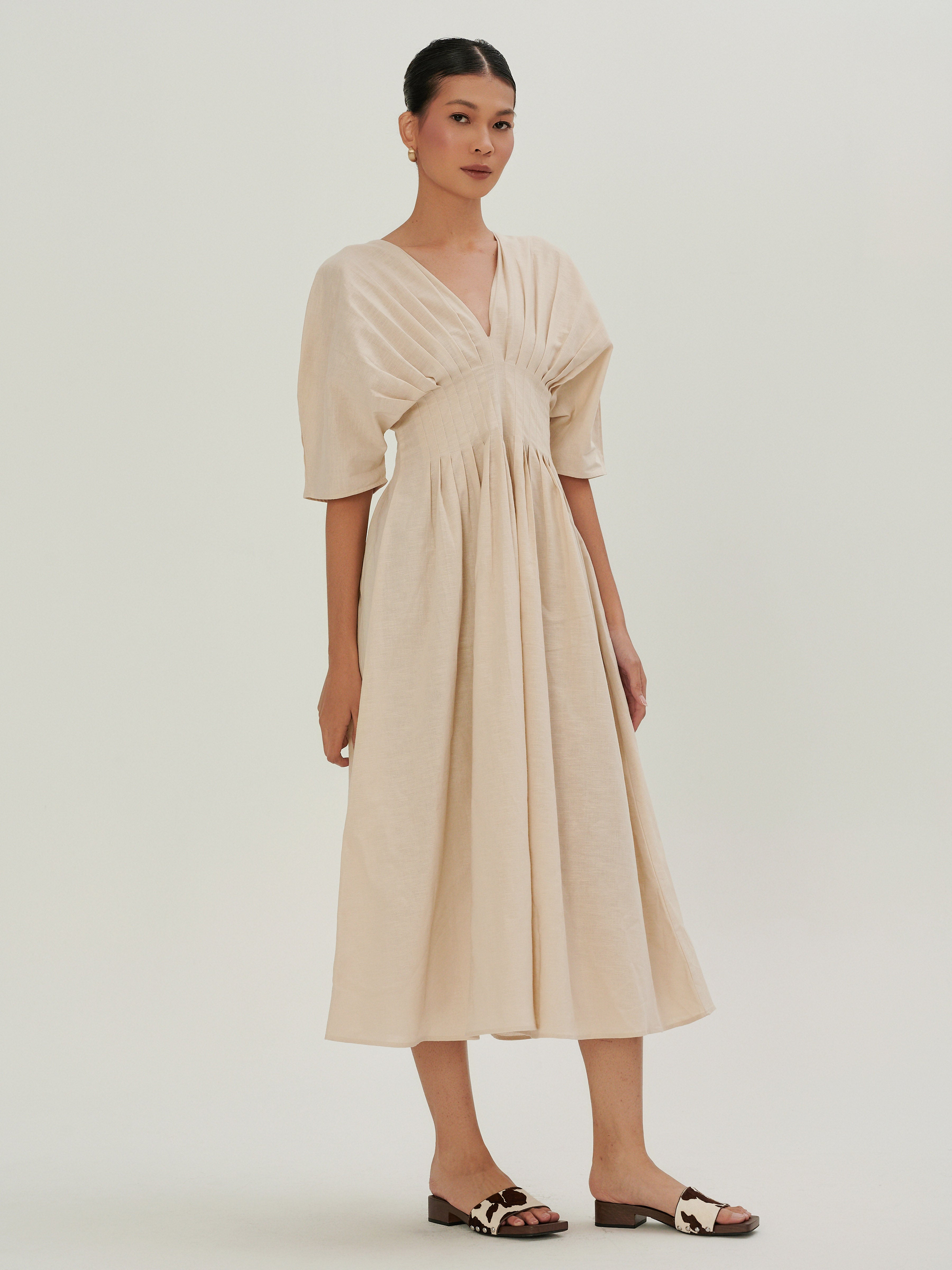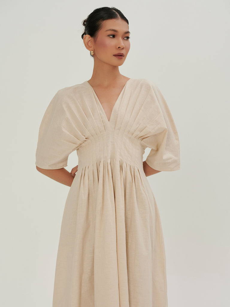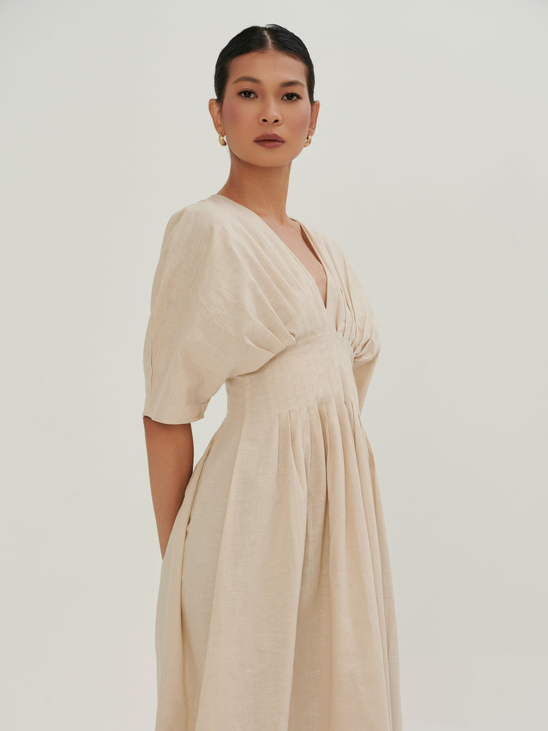 The Nia Dress is a gracefully flowing piece featuring a V neckline with 16 top-stitched pleats and elegant elbow-length sleeves, creating a sophisticated silhouette. The design gently cinches at the waist, giving the illusion of a smaller waist, and it’s finished with a back zipper closure for ease of wear. Crafted from linen, this dress is airy, breathable, and exceptionally comfortable, made with care in Malaysia.