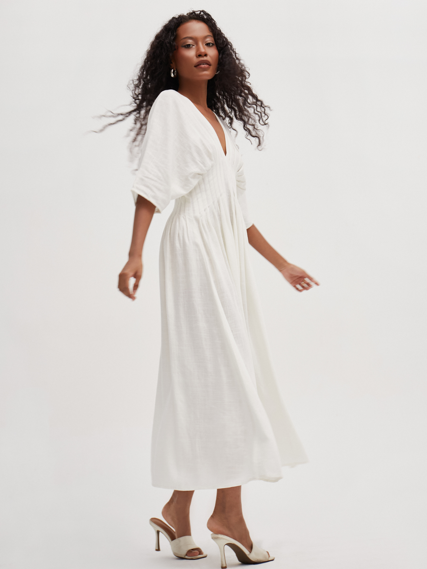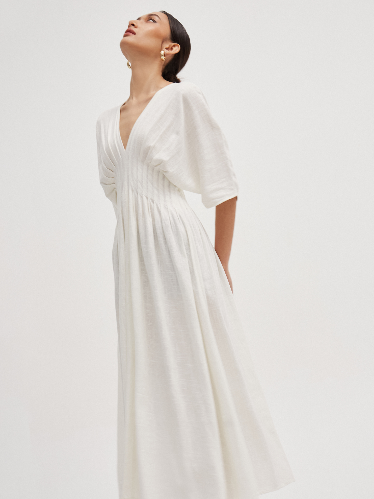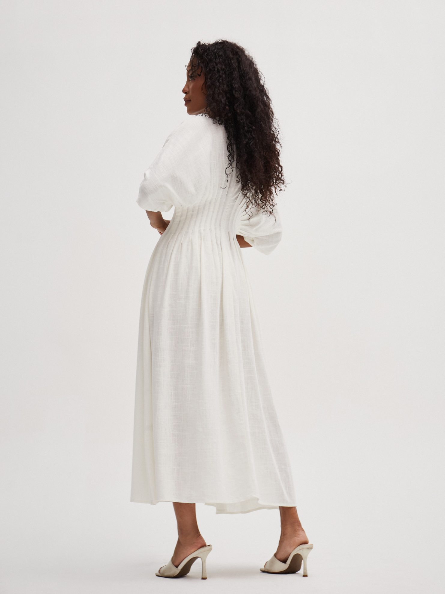 The Nia Dress is a gracefully flowing piece featuring a V neckline with 16 top-stitched pleats and elegant elbow-length sleeves, creating a sophisticated silhouette. The design gently cinches at the waist, giving the illusion of a smaller waist, and it’s finished with a back zipper closure for ease of wear. Crafted from linen, this dress is airy, breathable, and exceptionally comfortable, made with care in Malaysia.