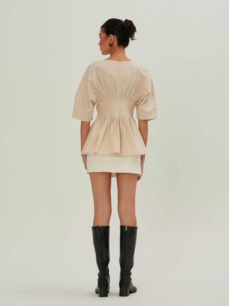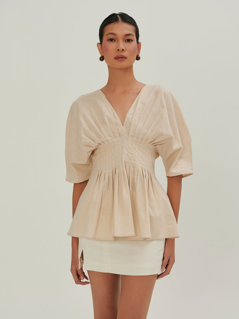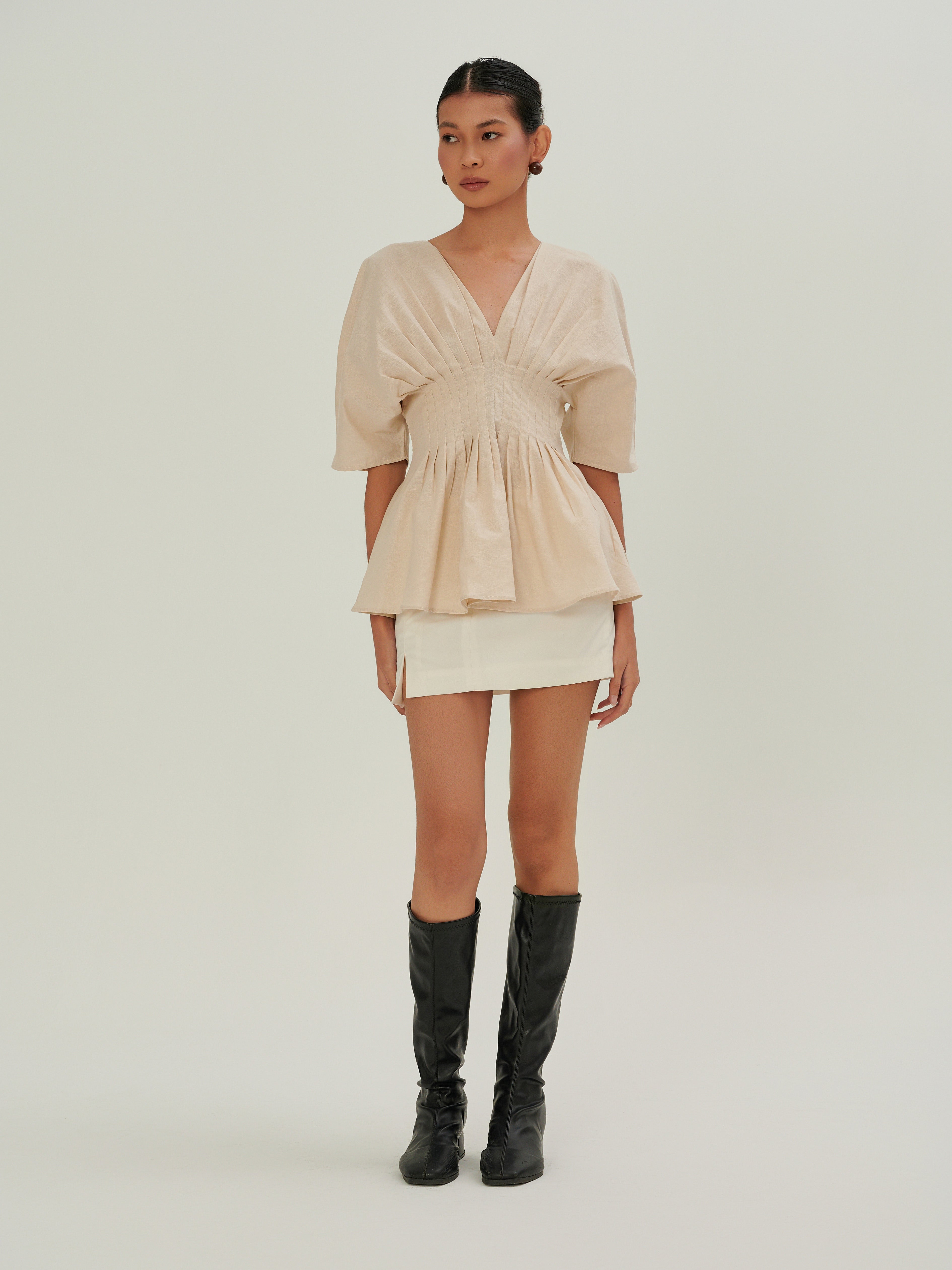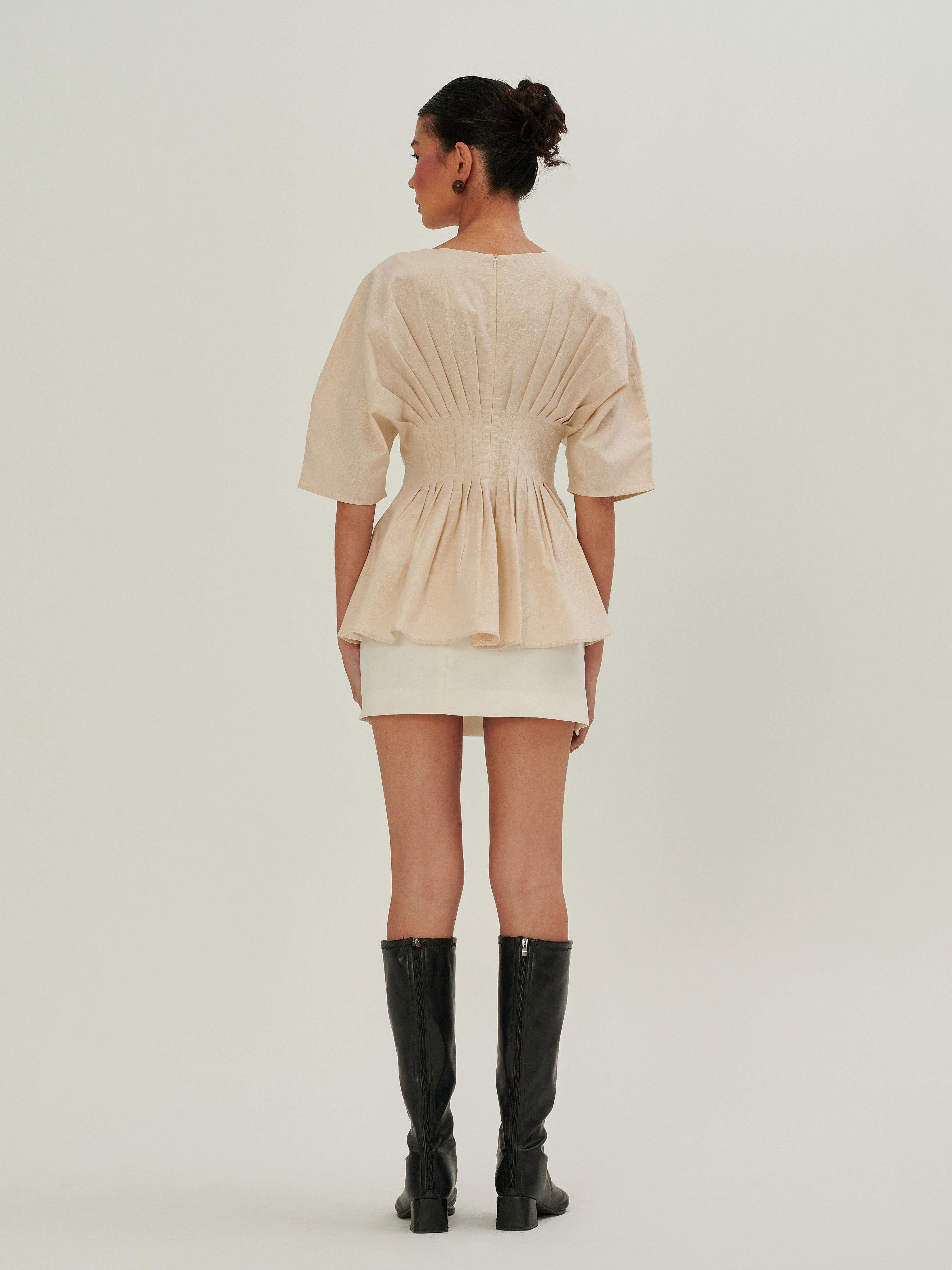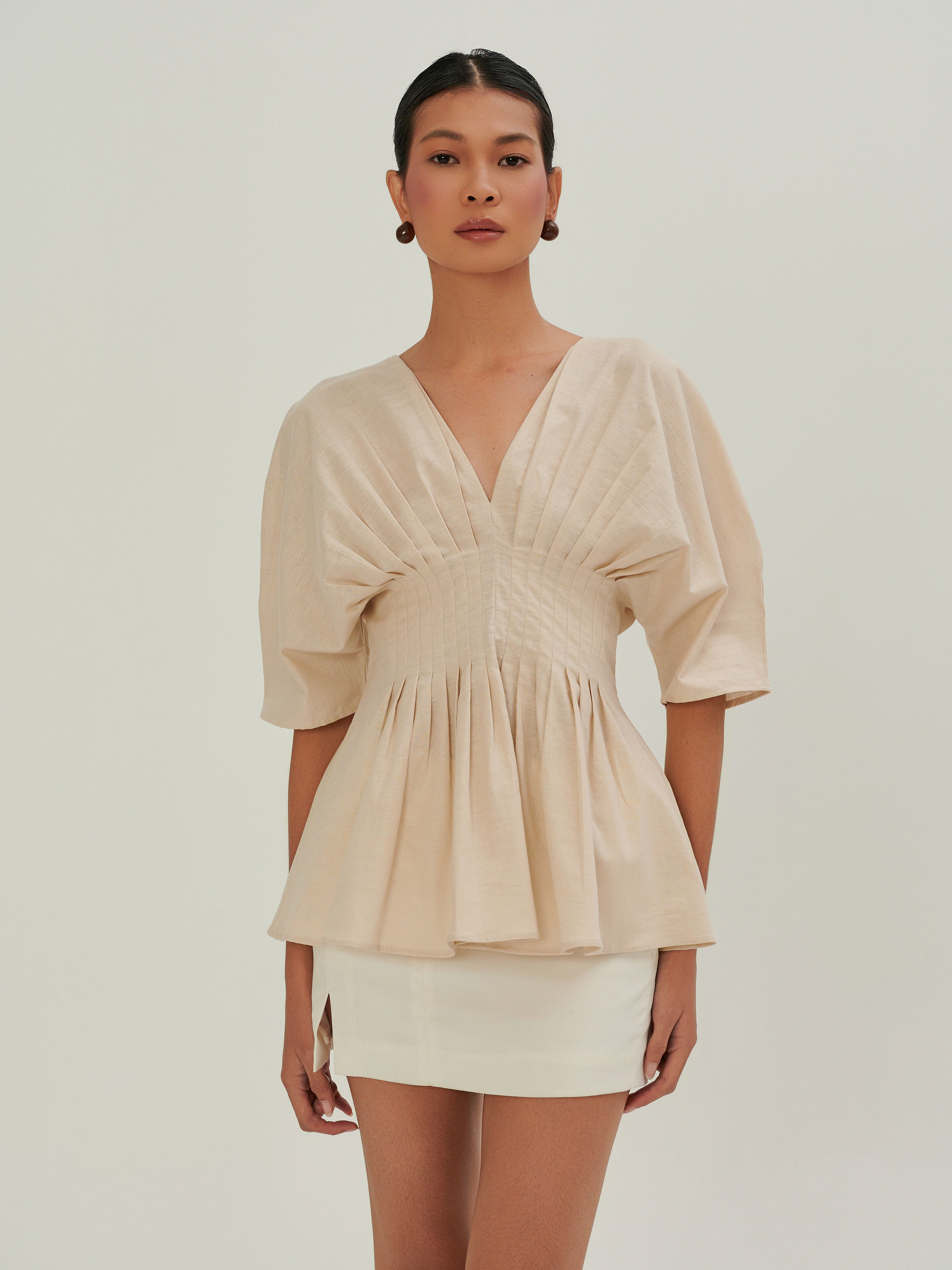 Crafted from linen, it features a clean V neckline that subtly highlights the collarbone. 16 precise pleats at the front and back create a soft, graceful drape that moves with ease. A concealed back zipper ensures a smooth fit and easy wear.Thoughtfully made in Malaysia