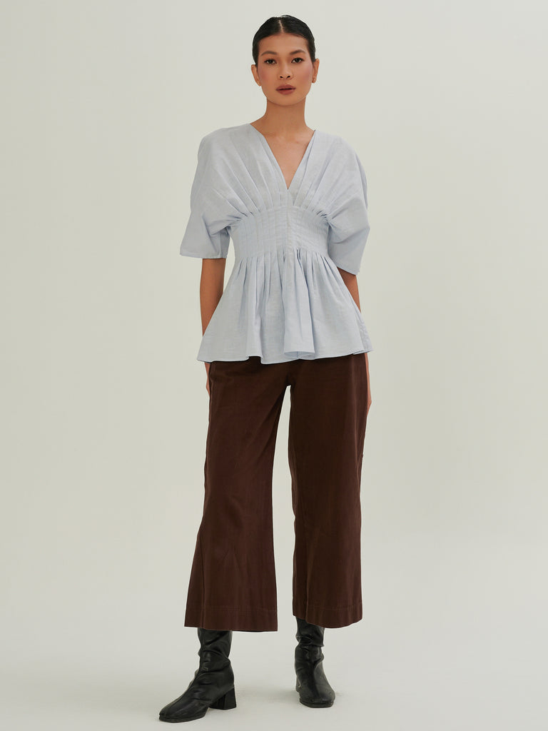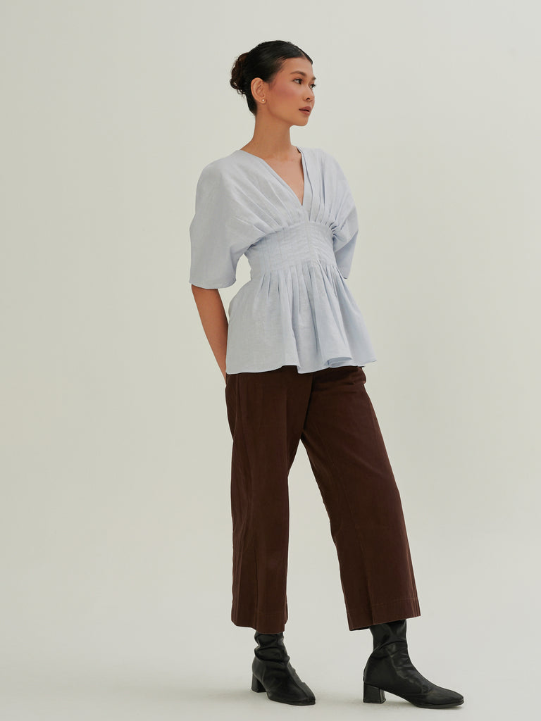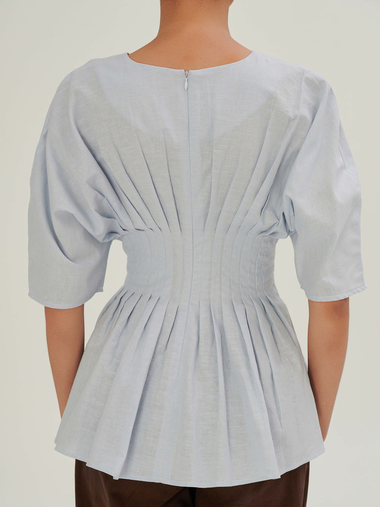 Crafted from linen, it features a clean V neckline that subtly highlights the collarbone. 16 precise pleats at the front and back create a soft, graceful drape that moves with ease. A concealed back zipper ensures a smooth fit and easy wear.Thoughtfully made in Malaysia