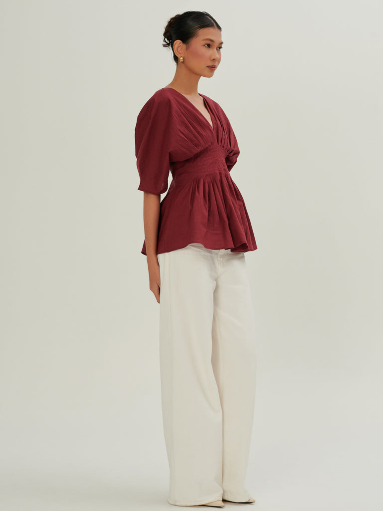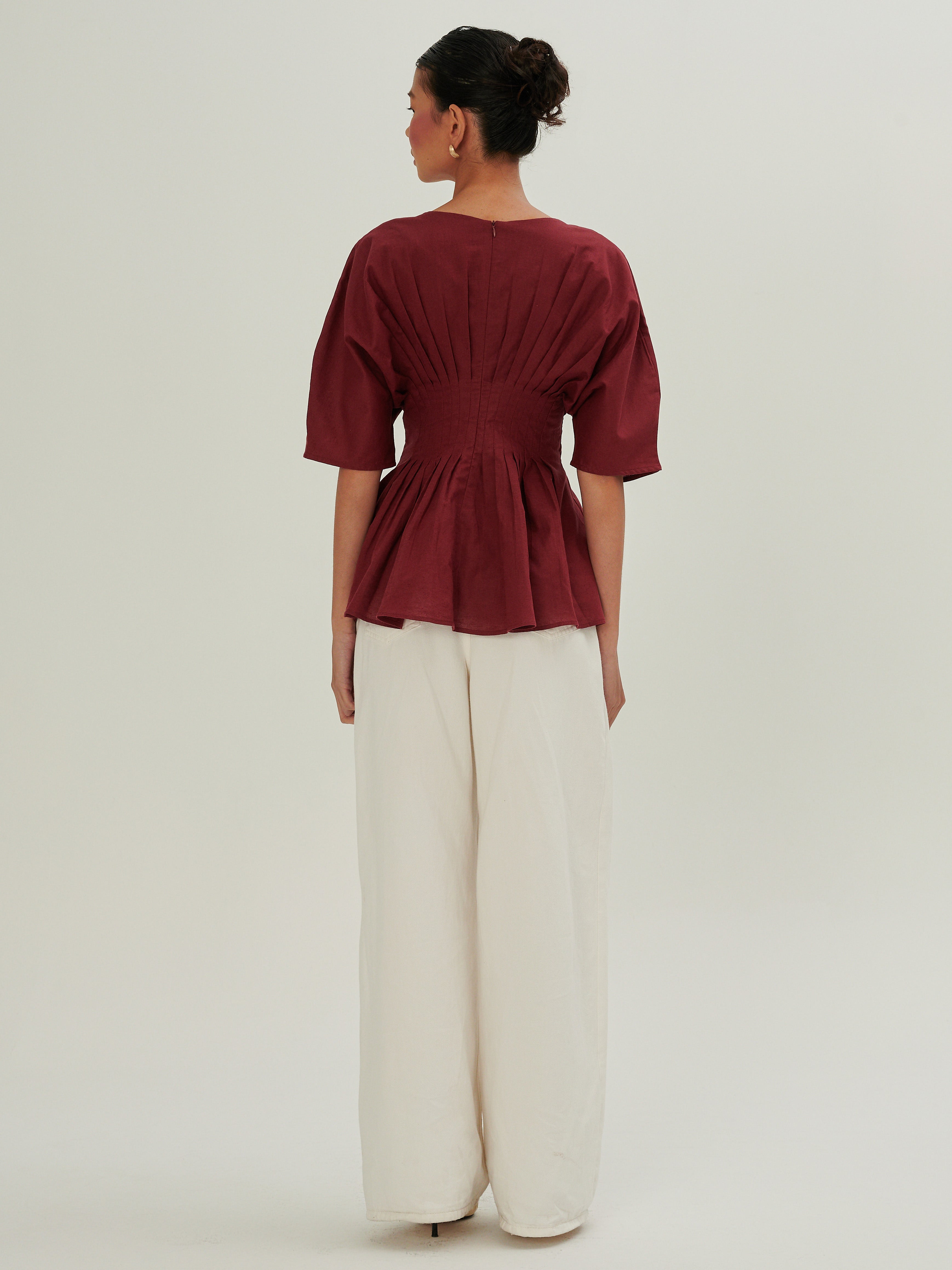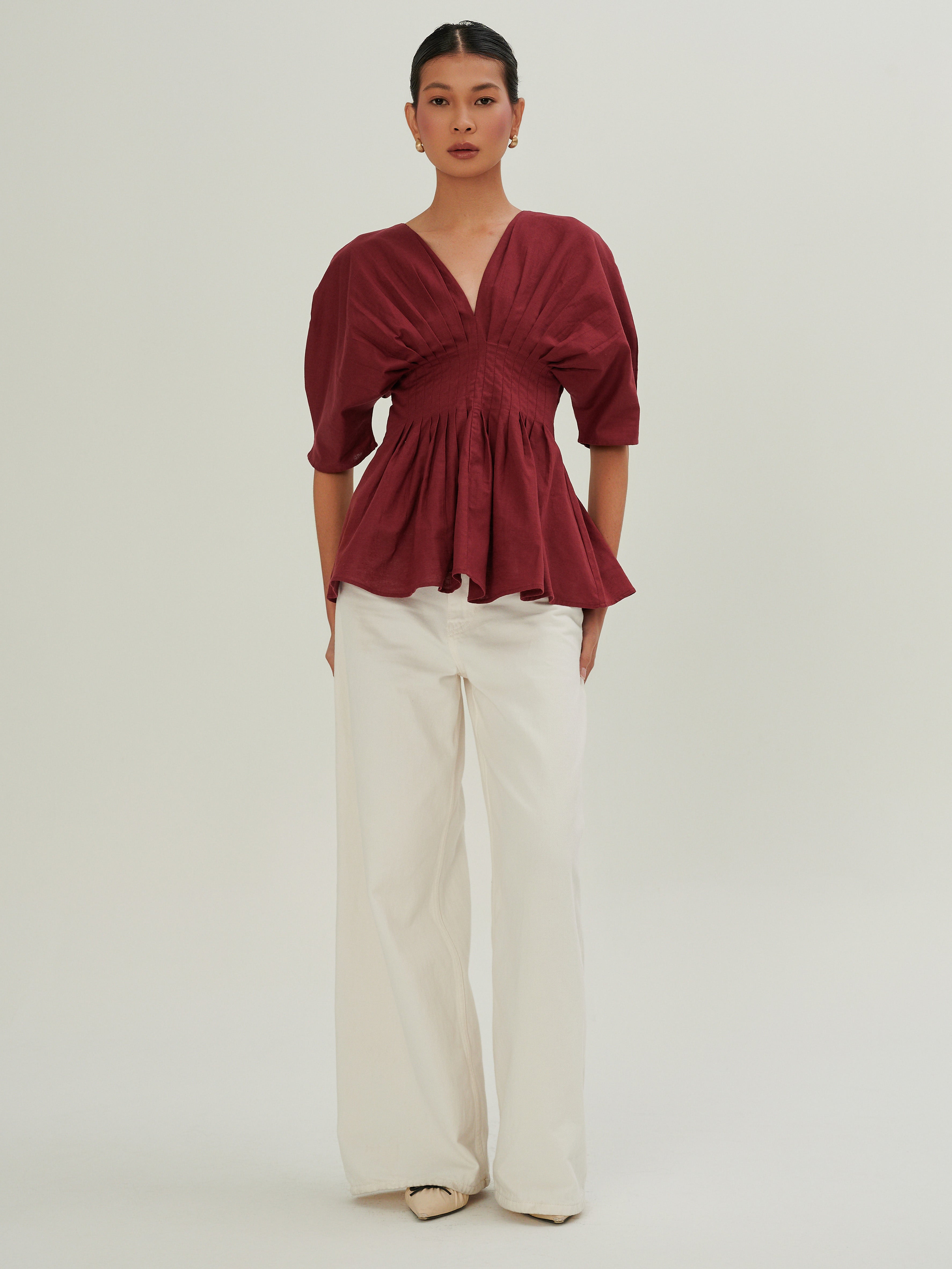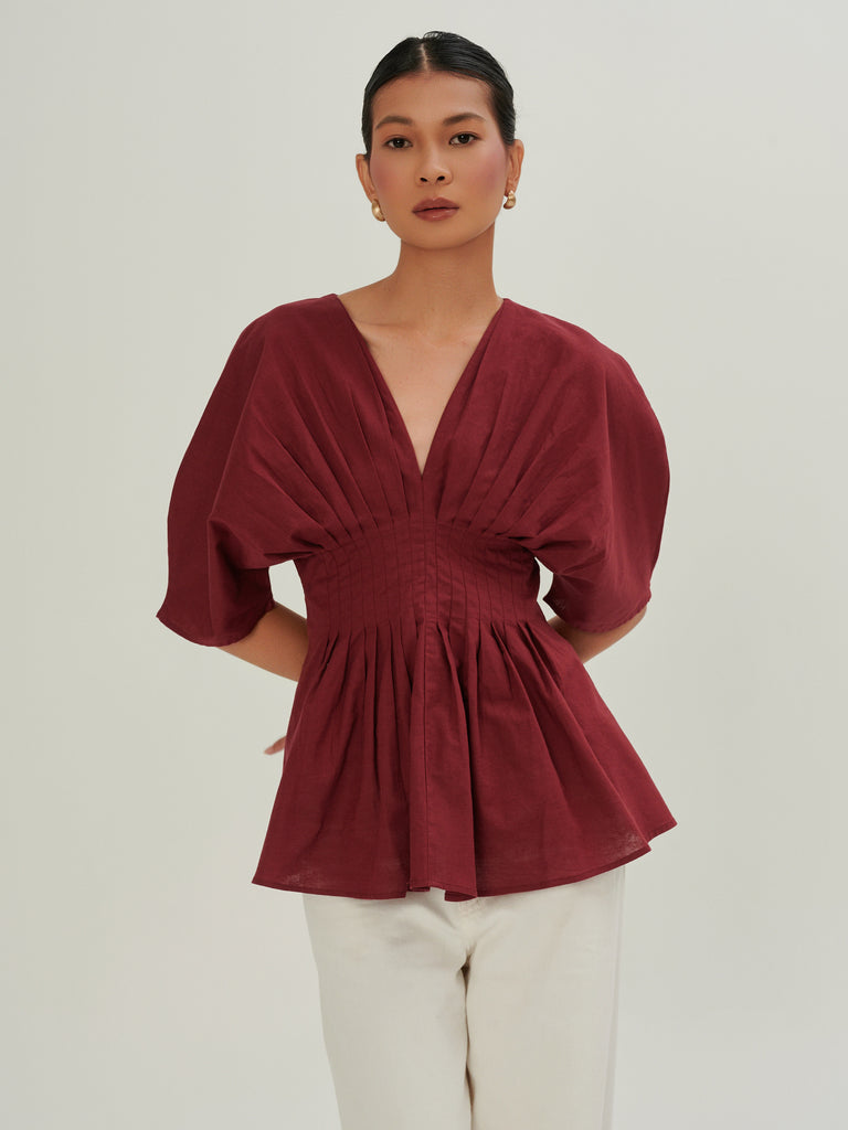 Crafted from linen, it features a clean V neckline that subtly highlights the collarbone. 16 precise pleats at the front and back create a soft, graceful drape that moves with ease. A concealed back zipper ensures a smooth fit and easy wear.Thoughtfully made in Malaysia
