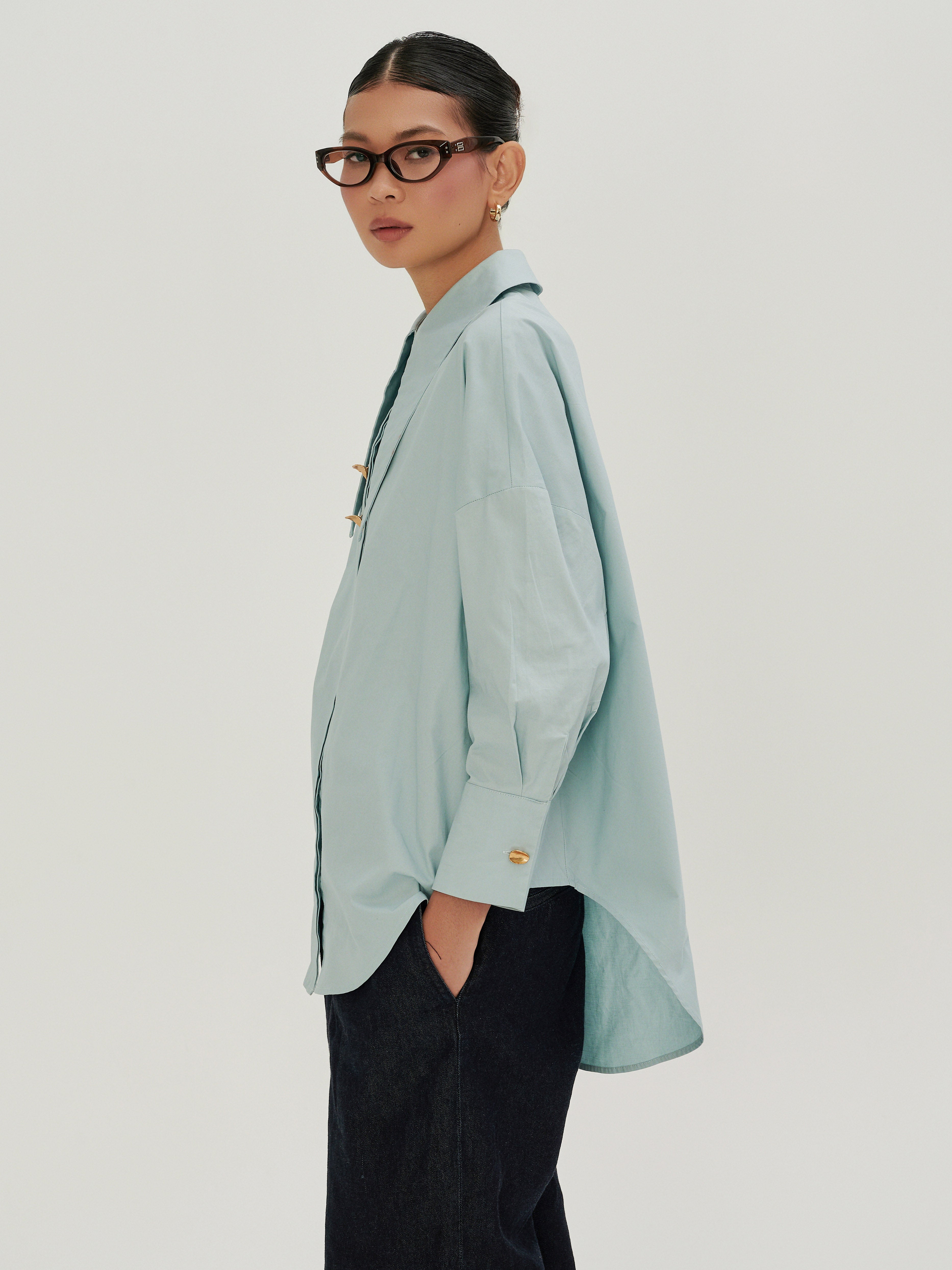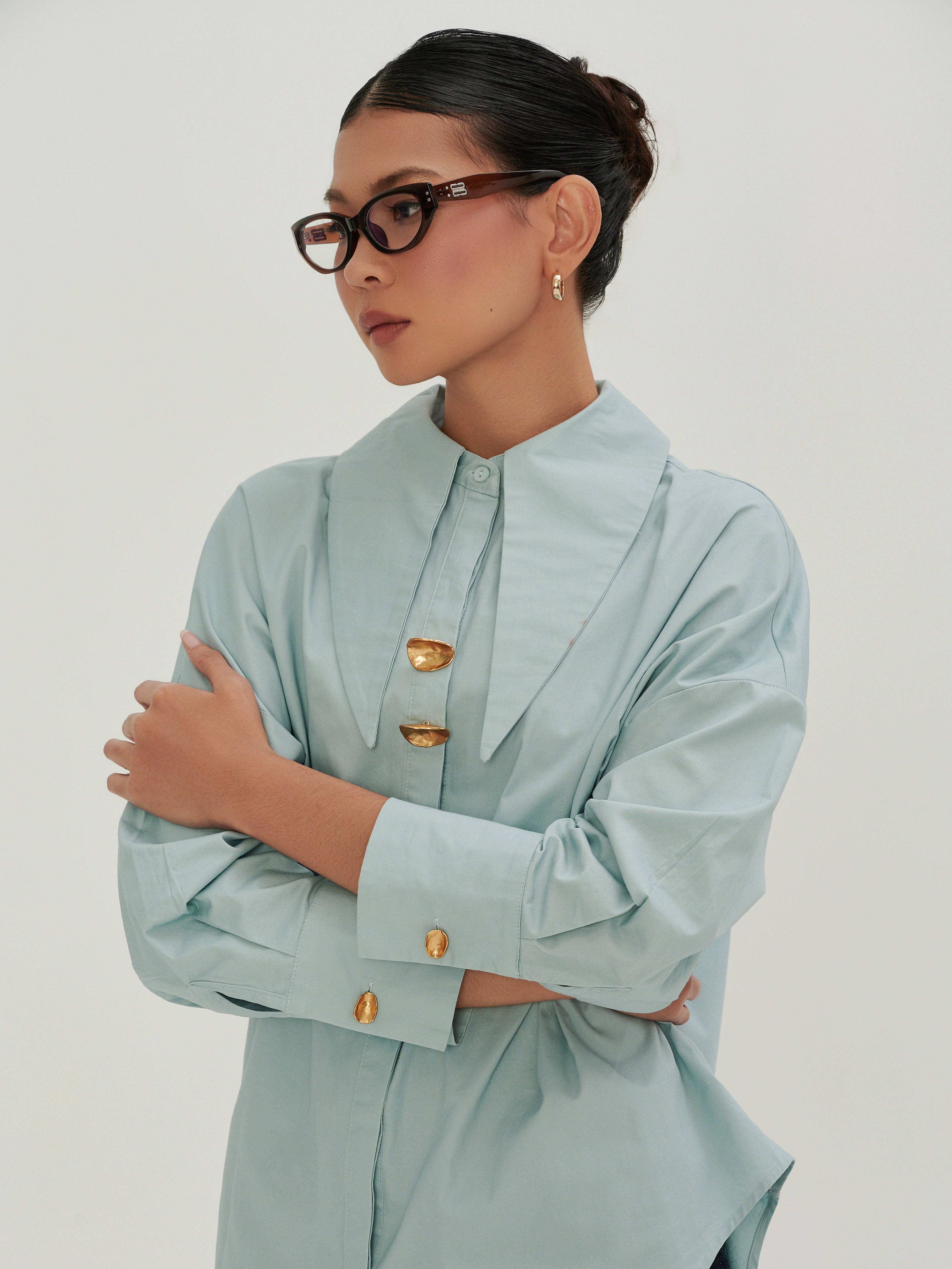 Introducing the upgraded OG Hanya Oversized Shirt—your new wardrobe staple. This shirt features a dramatic oversized collar and eye-catching gold buttons for a unique touch. The oversized, boxy silhouette offers a relaxed fit for comfort. Crafted from 100% lightweight cotton, it is breathable and soft against the skin
