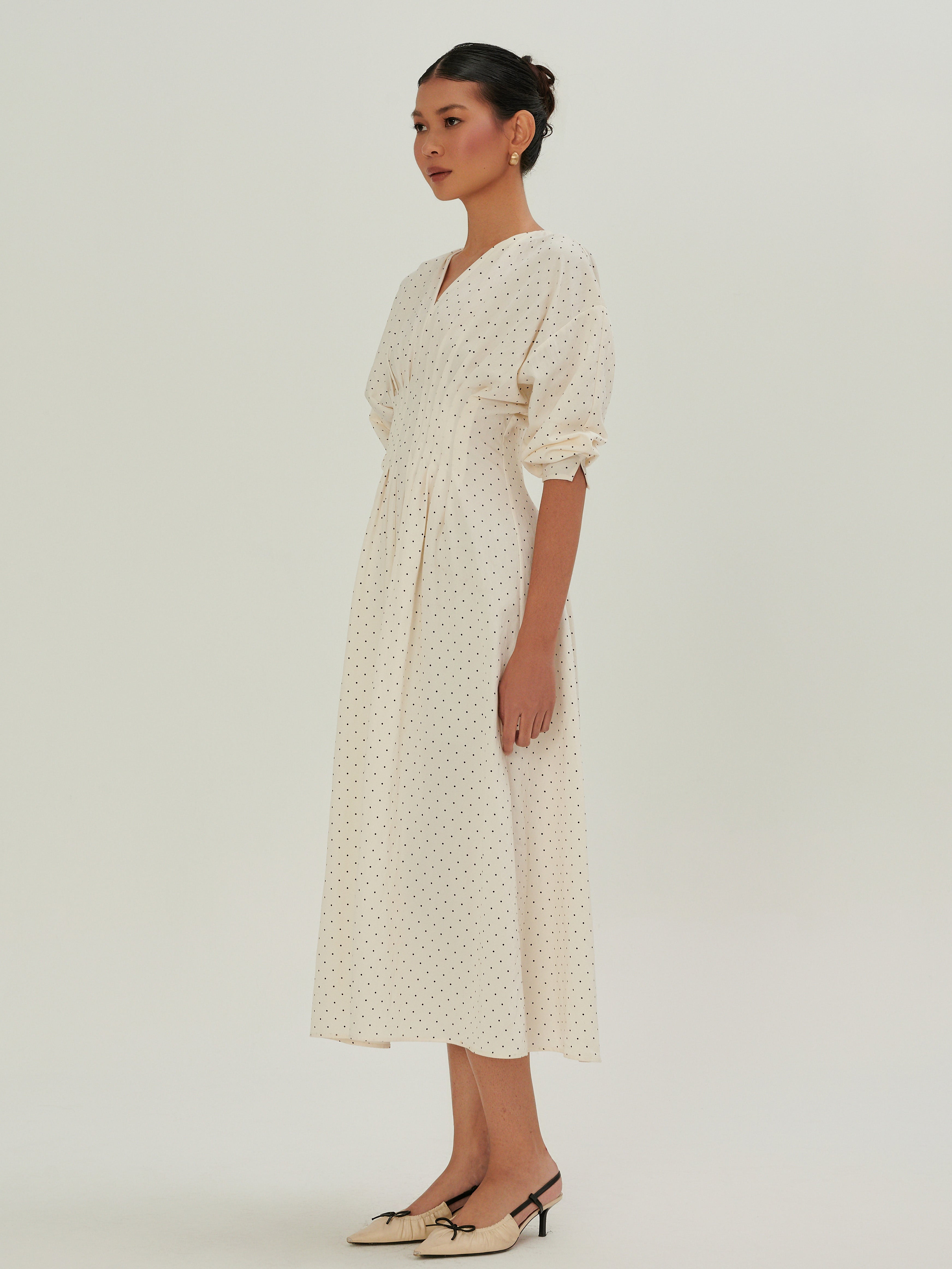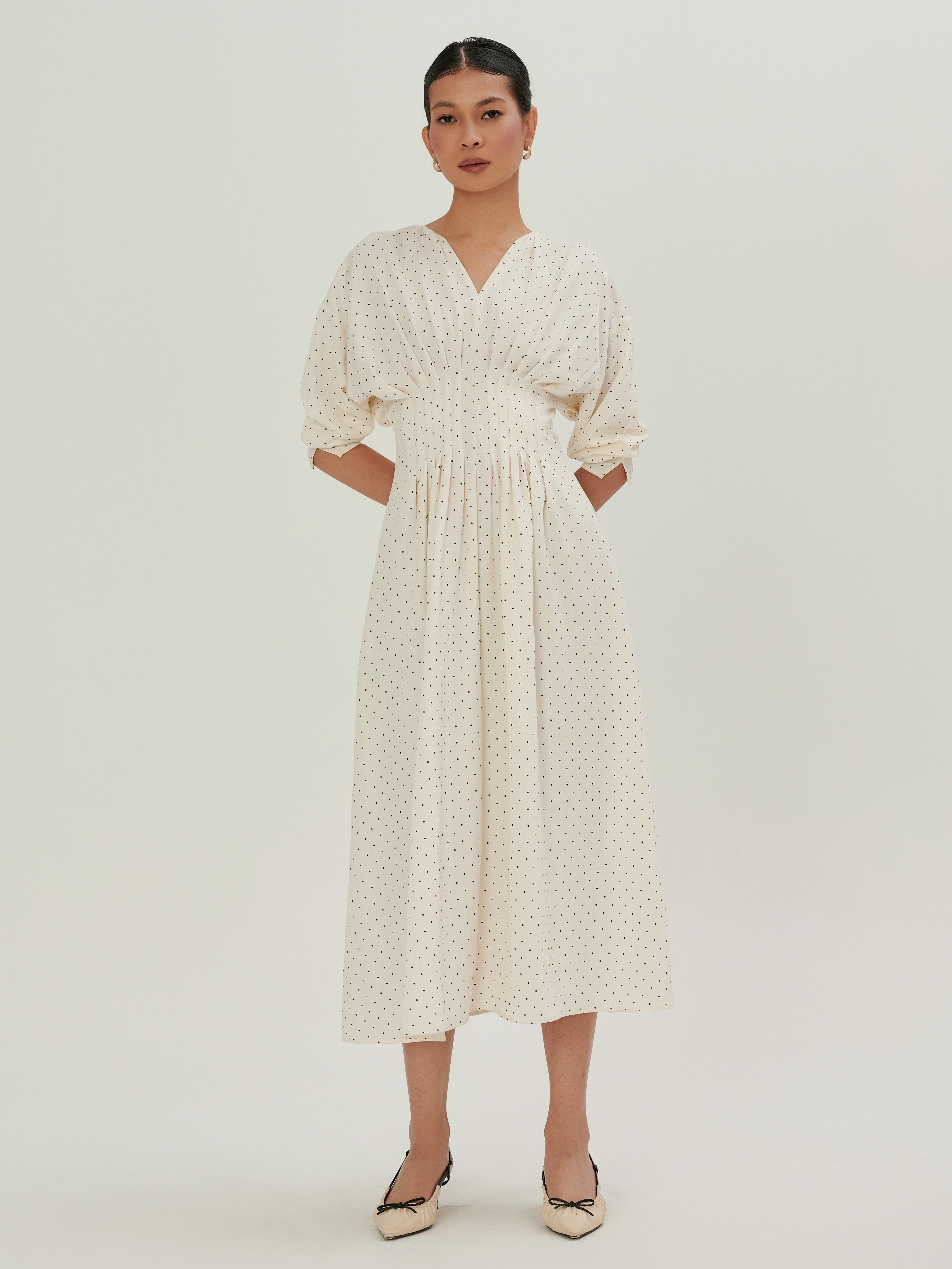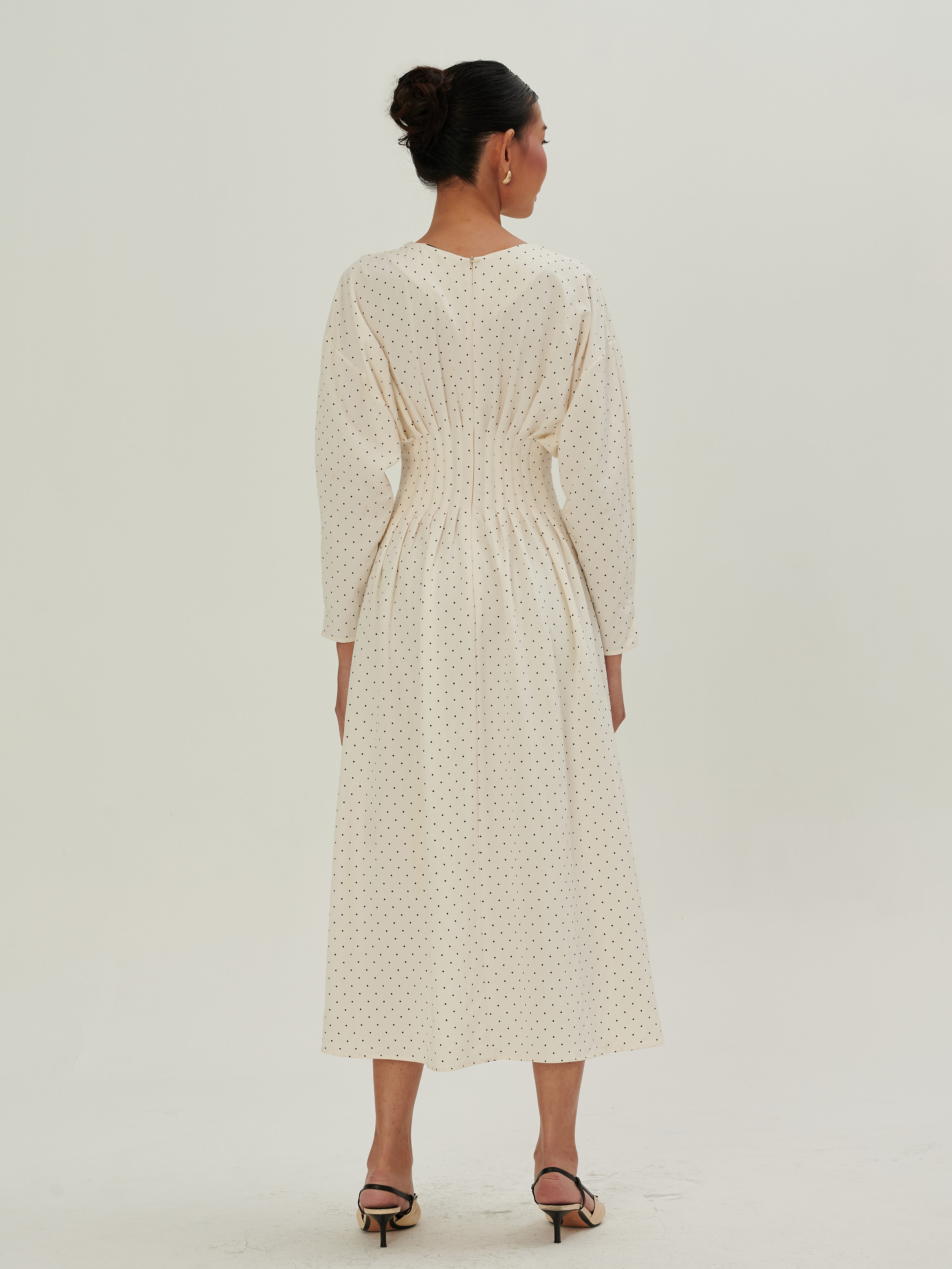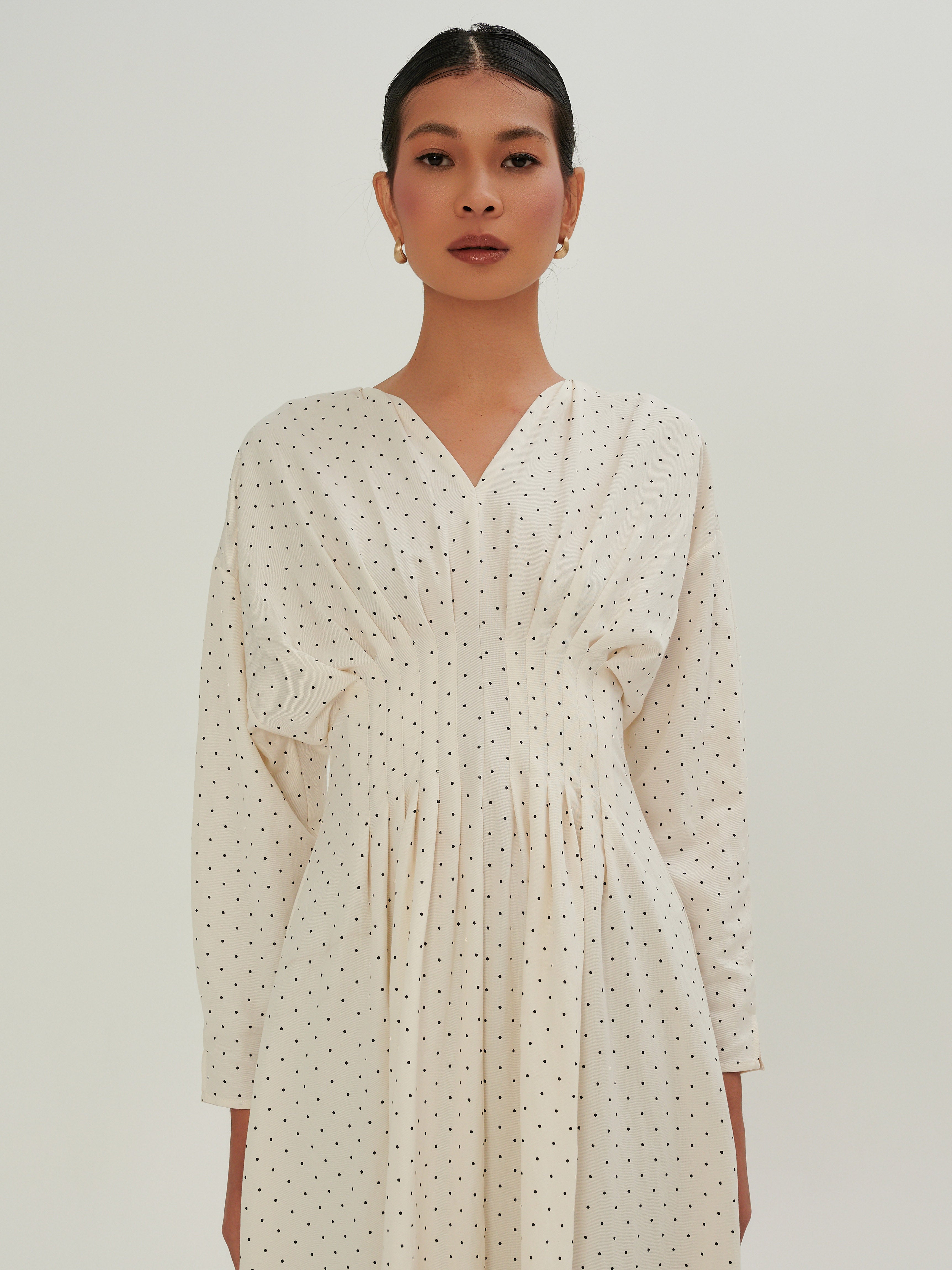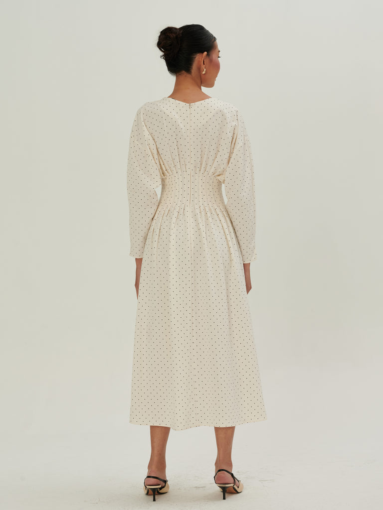 Introducing our latest polka dot dress—a modern take on a classic print. This full-length design features a flattering V-neckline and long sleeves, complemented by a tailored pleated waist panel that creates a structured, flattering silhouette.