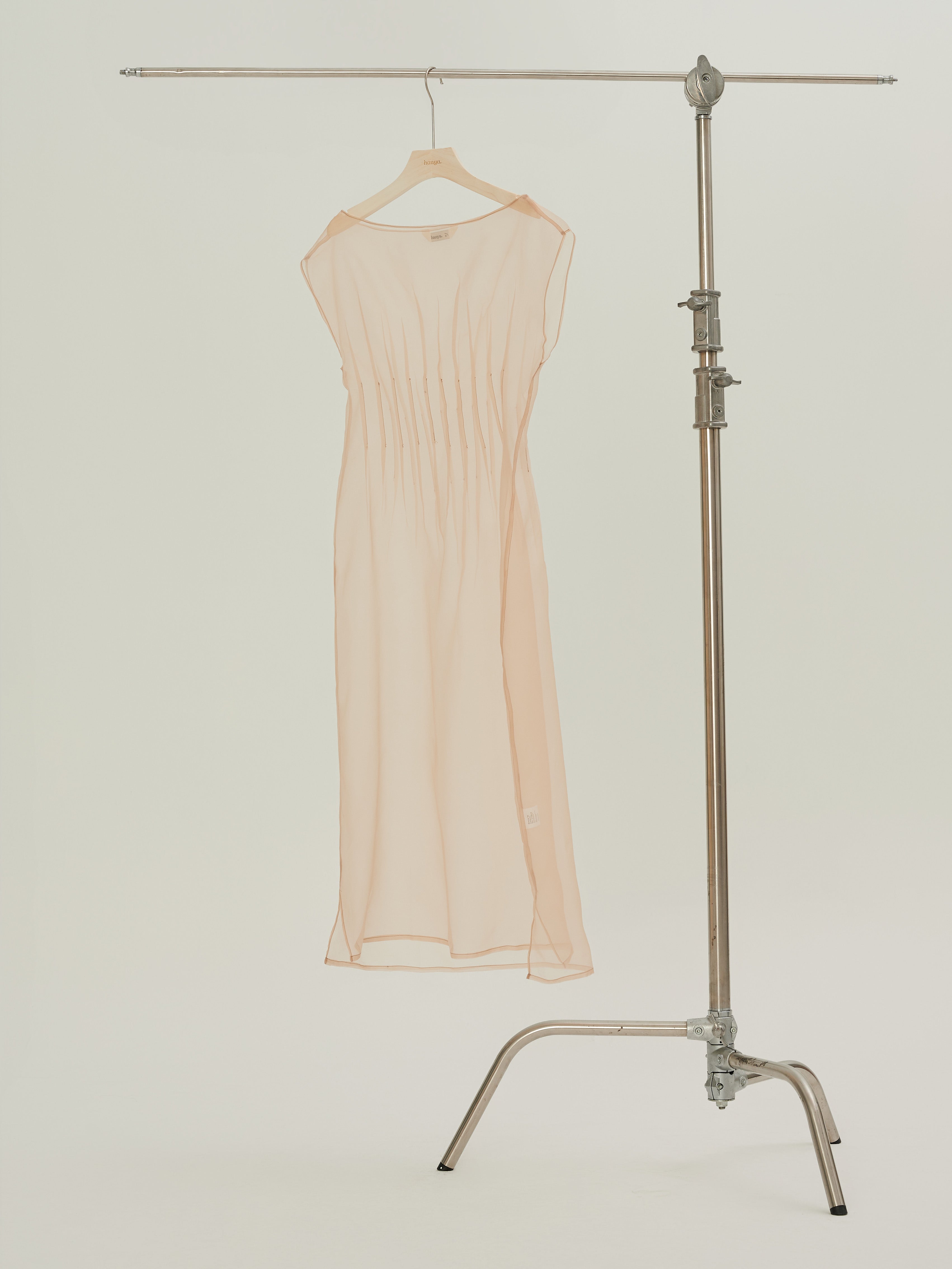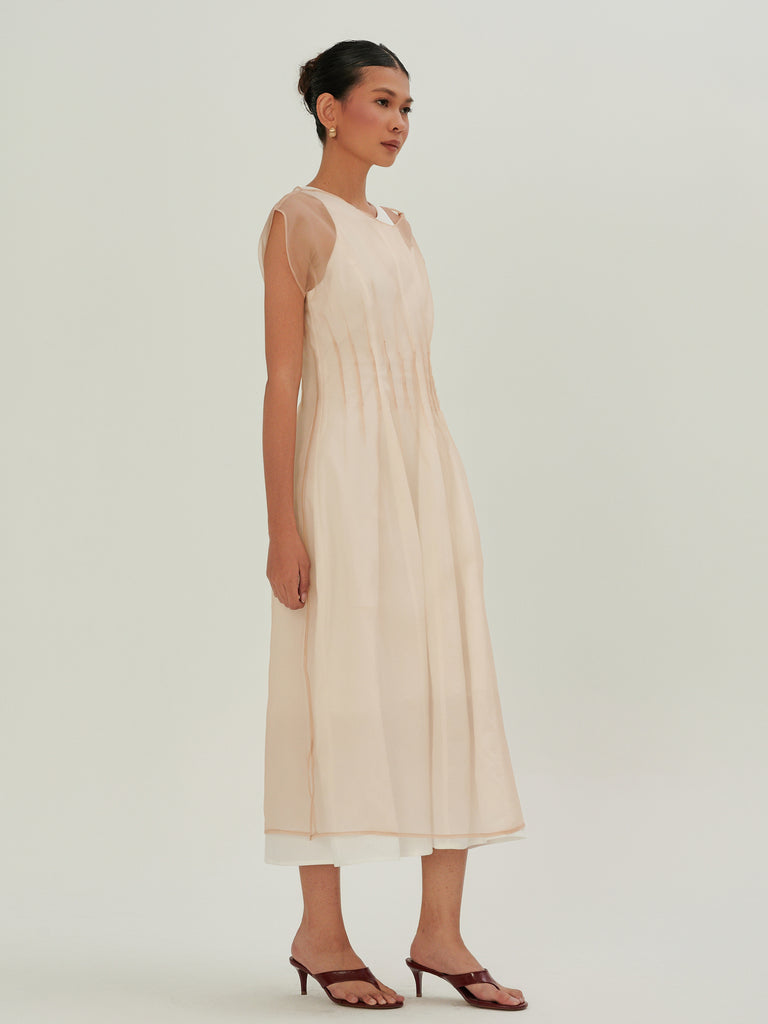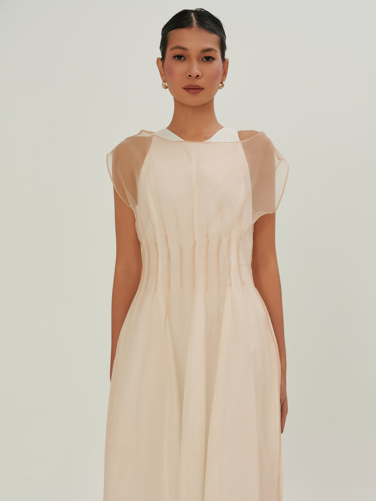 Introducing our newest sheer layered dress—a graceful blend of structure and softness. This design features a delicate translucent overlay that drapes elegantly over the shoulders and neckline, adding a feminine touch to its tailored shape. Its soft pleats cinch the waist, flowing into a flattering skirt that creates an elongated silhouette.